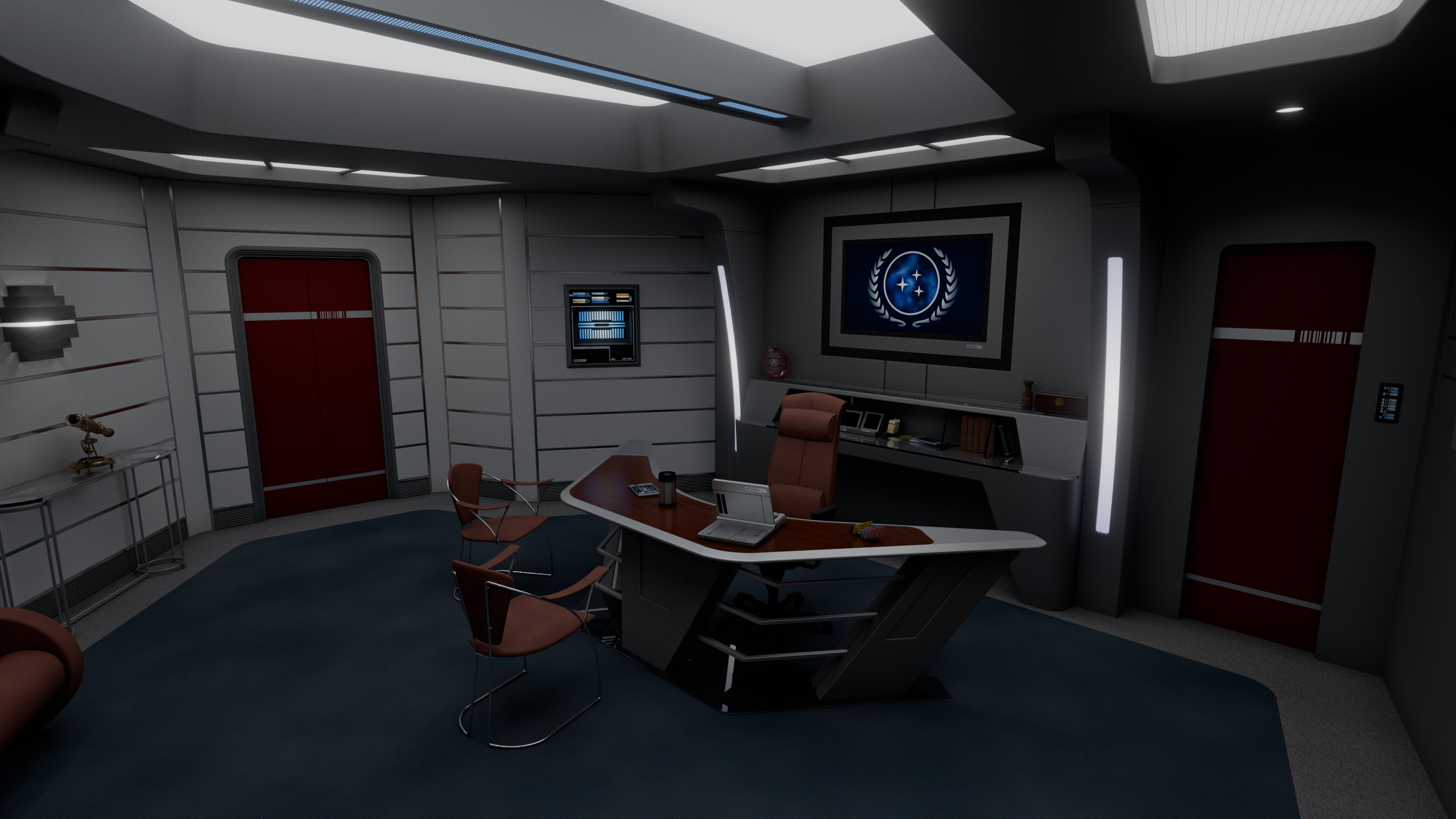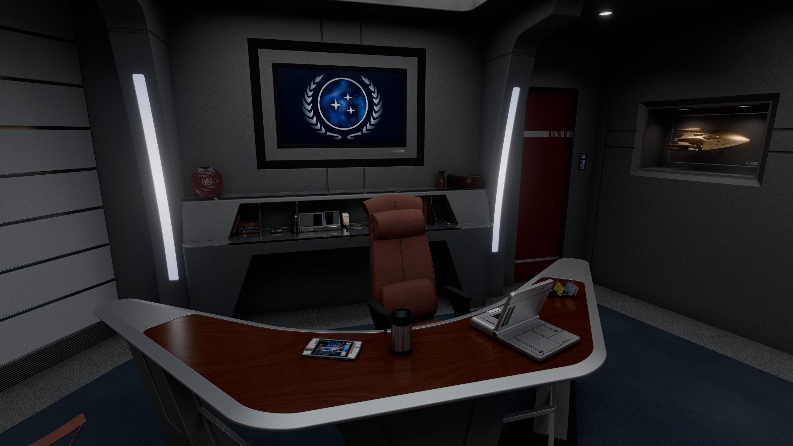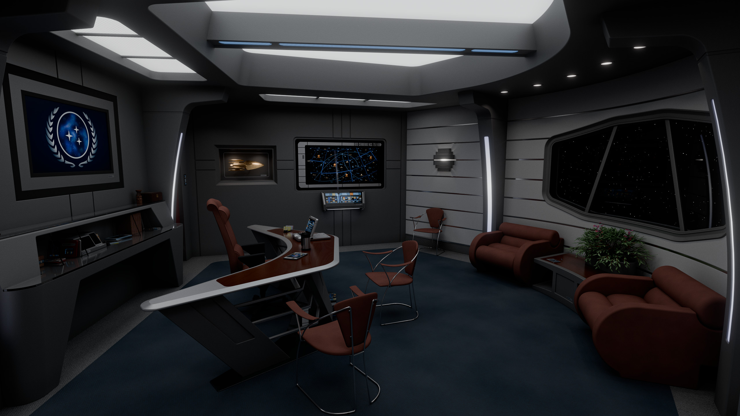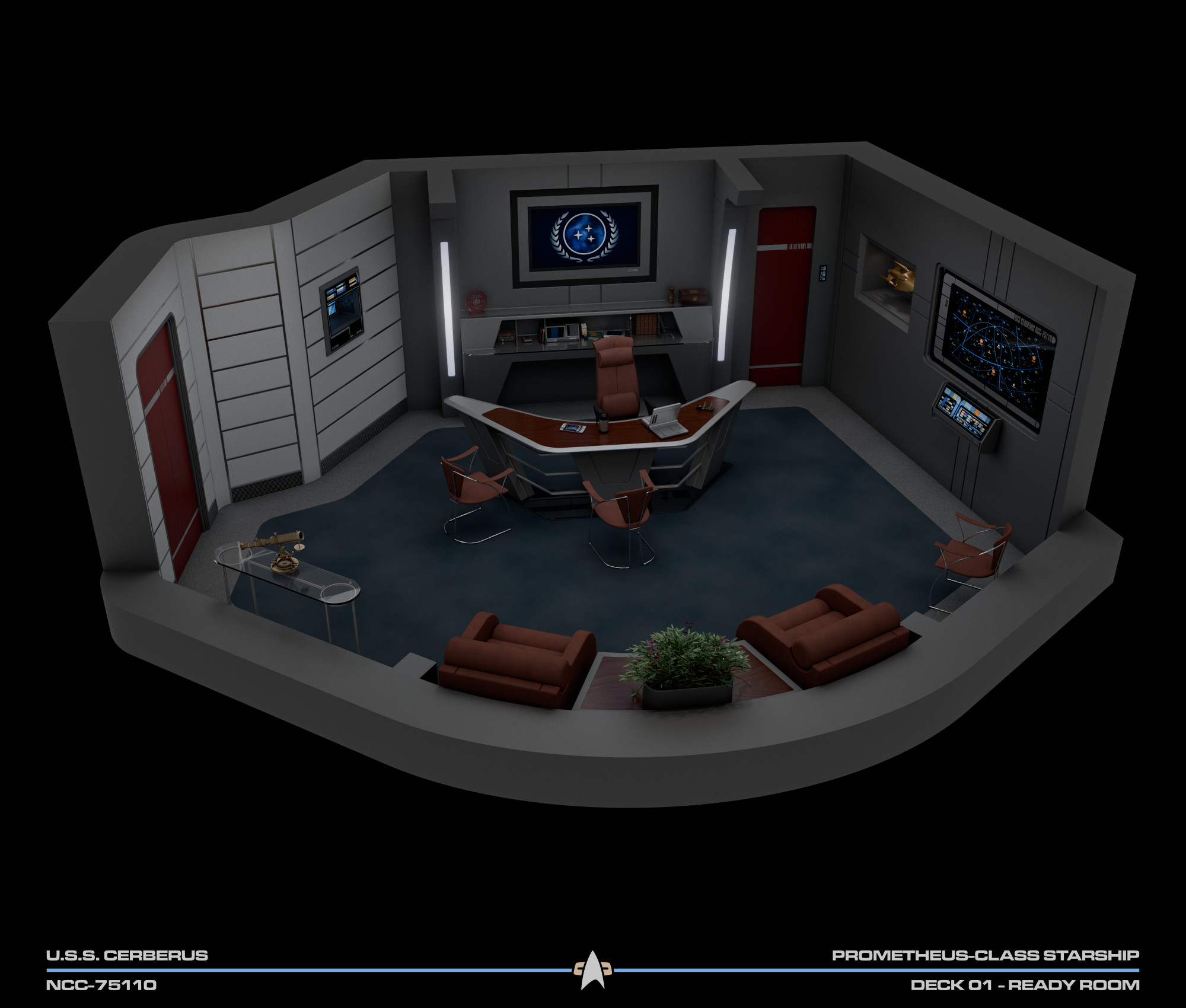 The admiral’s desk occupied the center of the room, behind it was a large illuminated logo of the United Federation of Planets, visible on any communication the admiral would engage on from the room. The wall to the left of the desk featured a large LCARS display with a direct uplink to Starfleet Command, as well as a model of Cerberus. Between this wall and the desk was a door leading to a small lavatory.