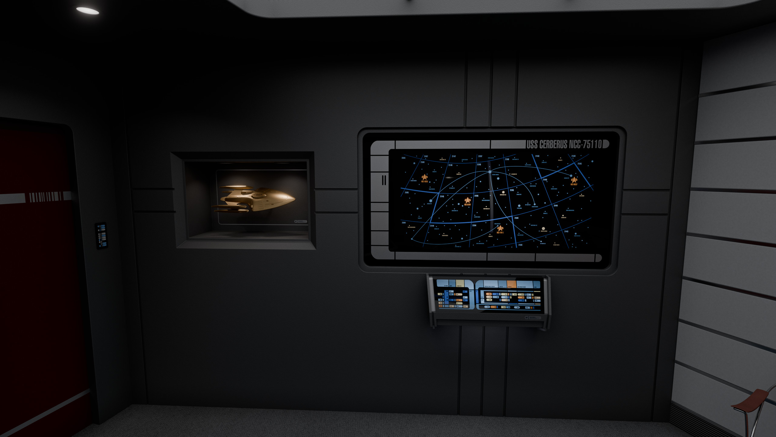 The admiral’s desk occupied the center of the room, behind it was a large illuminated logo of the United Federation of Planets, visible on any communication the admiral would engage on from the room. The wall to the left of the desk featured a large LCARS display with a direct uplink to Starfleet Command, as well as a model of Cerberus. Between this wall and the desk was a door leading to a small lavatory.