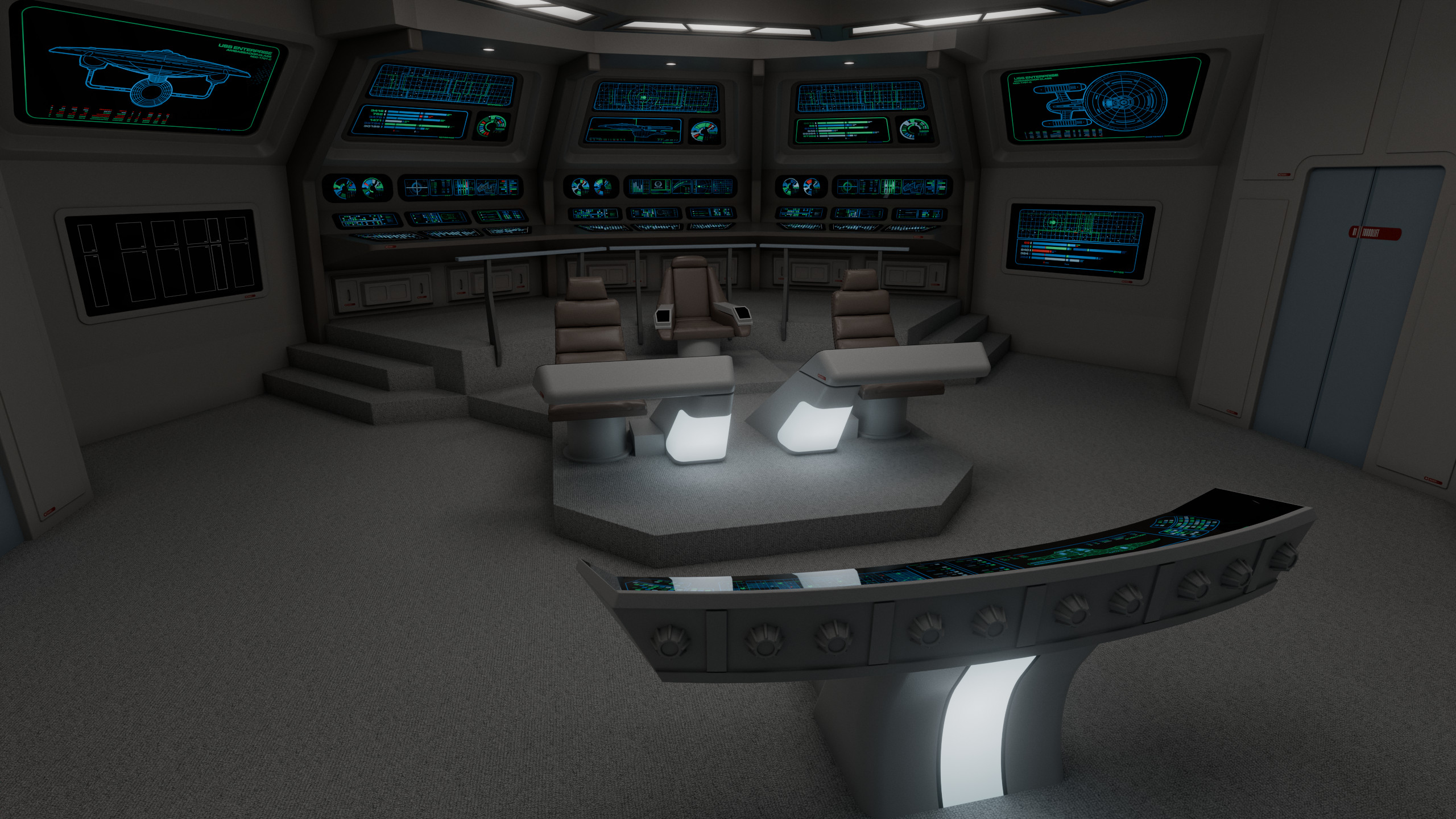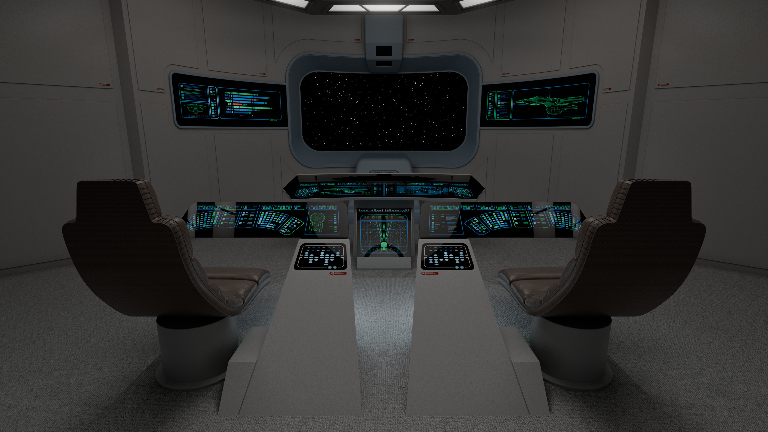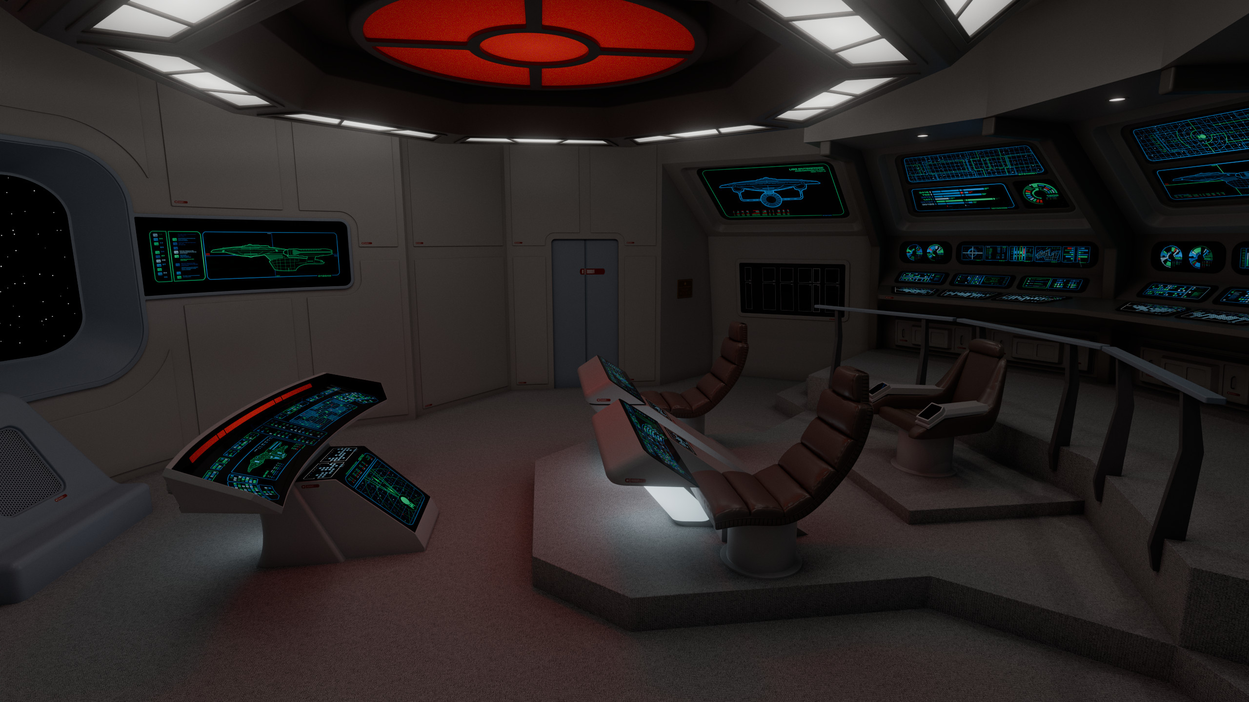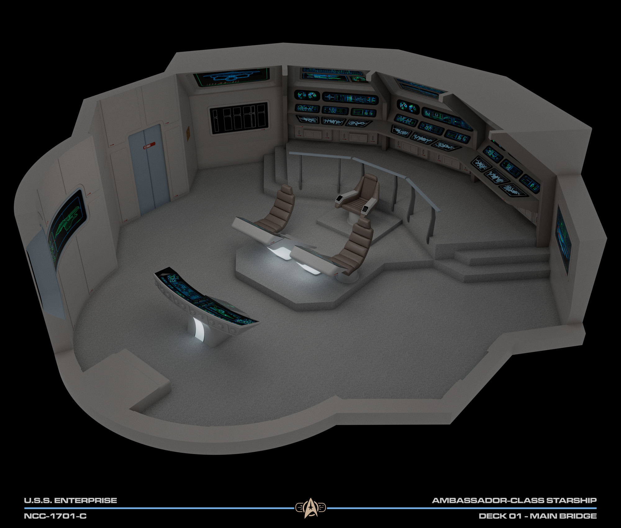 The aft wall contained three consoles, working clockwise from the viewscreen: science, engineering, and operations. In front of the captain were the flight control and tactical stations. At the very front of the bridge there was a master system display console, which could in an emergency be used to control any shipboard system, to give further redundancy to this new, more automated bridge design.