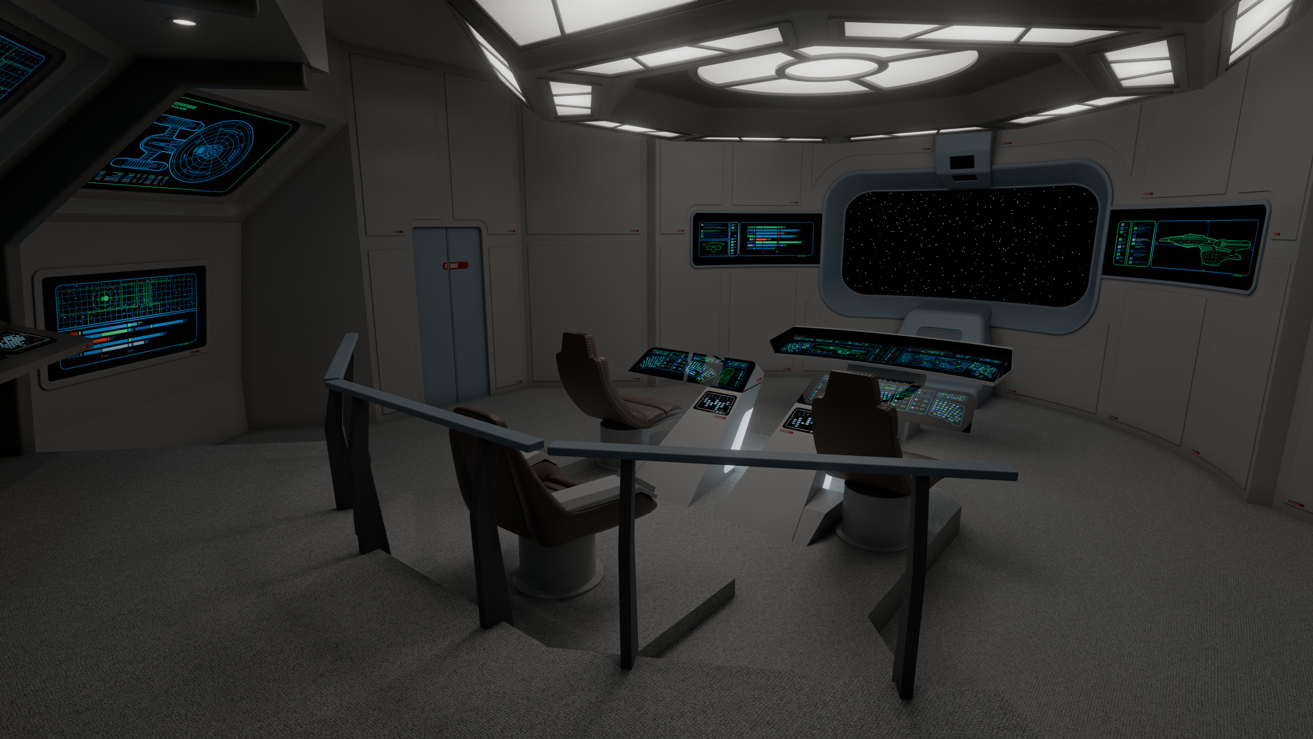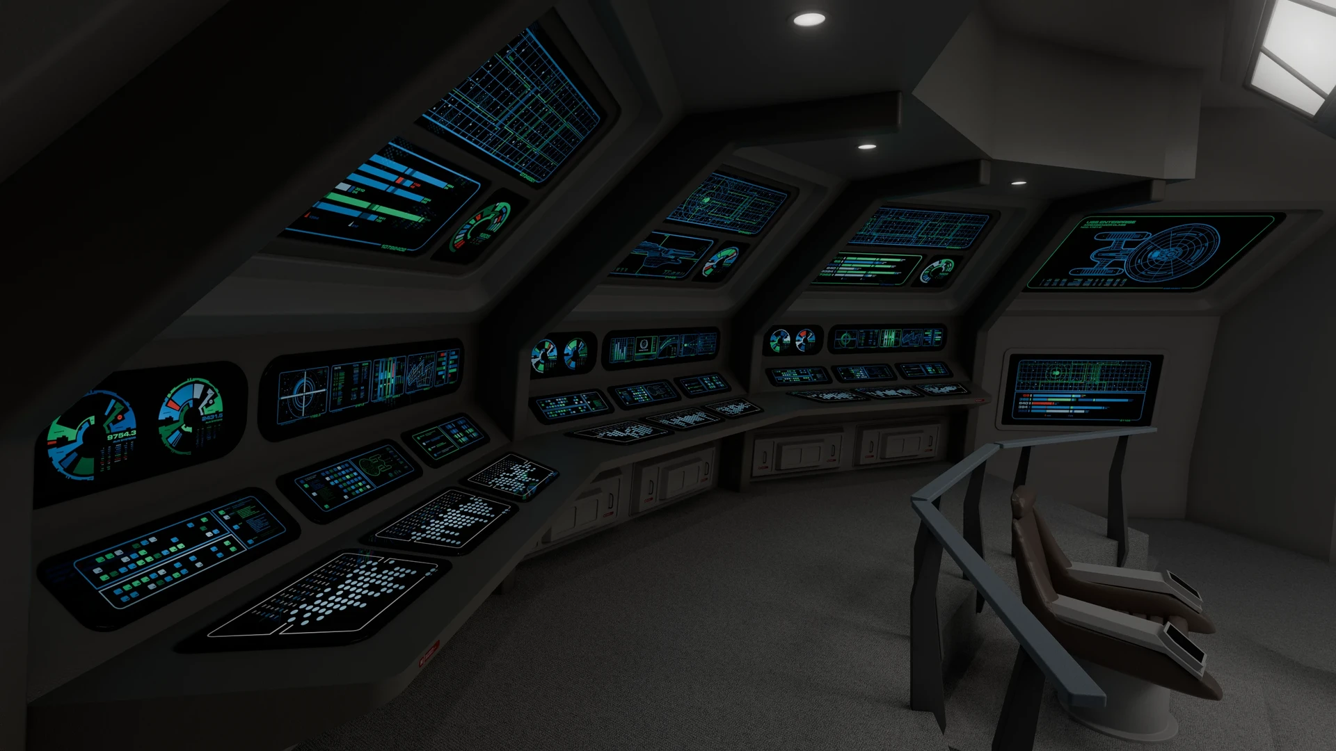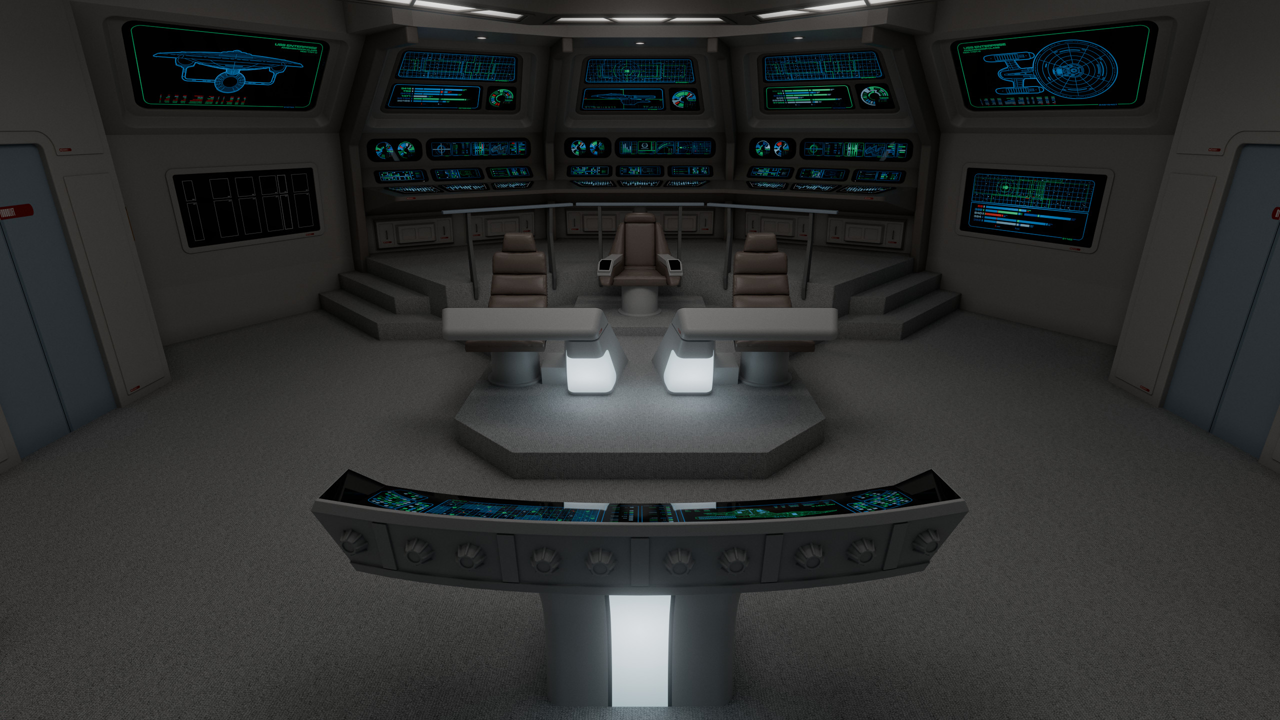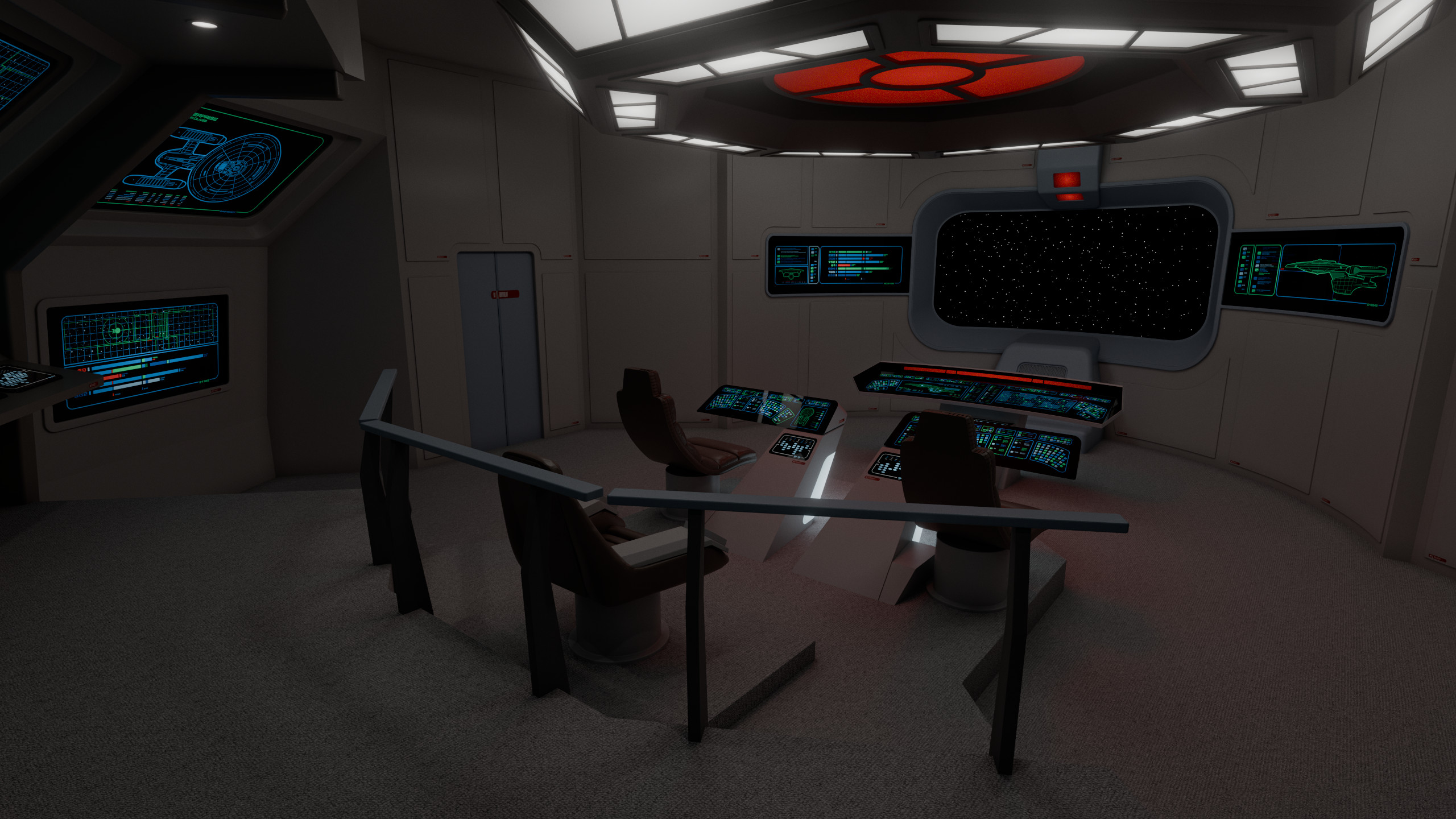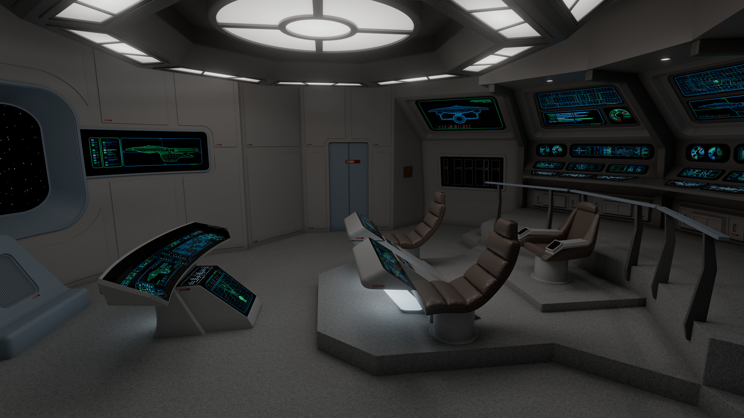 The aft wall contained three consoles, working clockwise from the viewscreen: science, engineering, and operations. In front of the captain were the flight control and tactical stations. At the very front of the bridge there was a master system display console, which could in an emergency be used to control any shipboard system, to give further redundancy to this new, more automated bridge design.