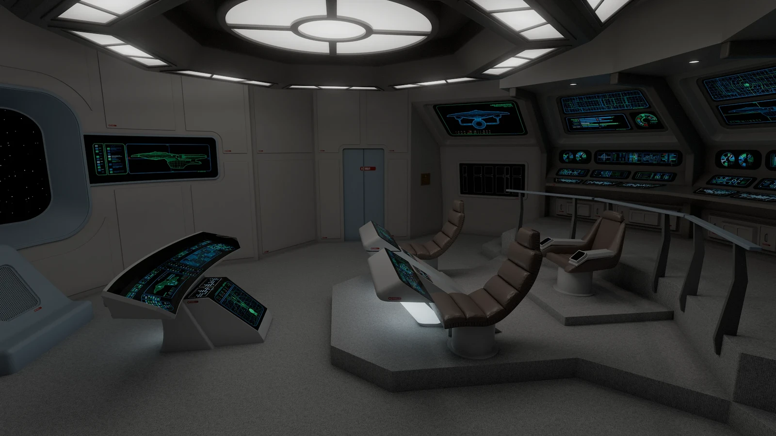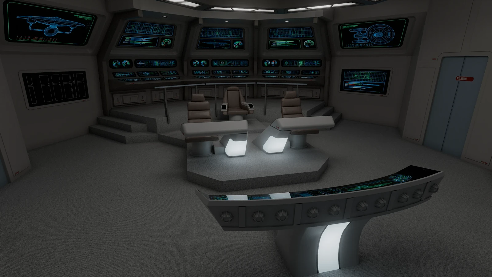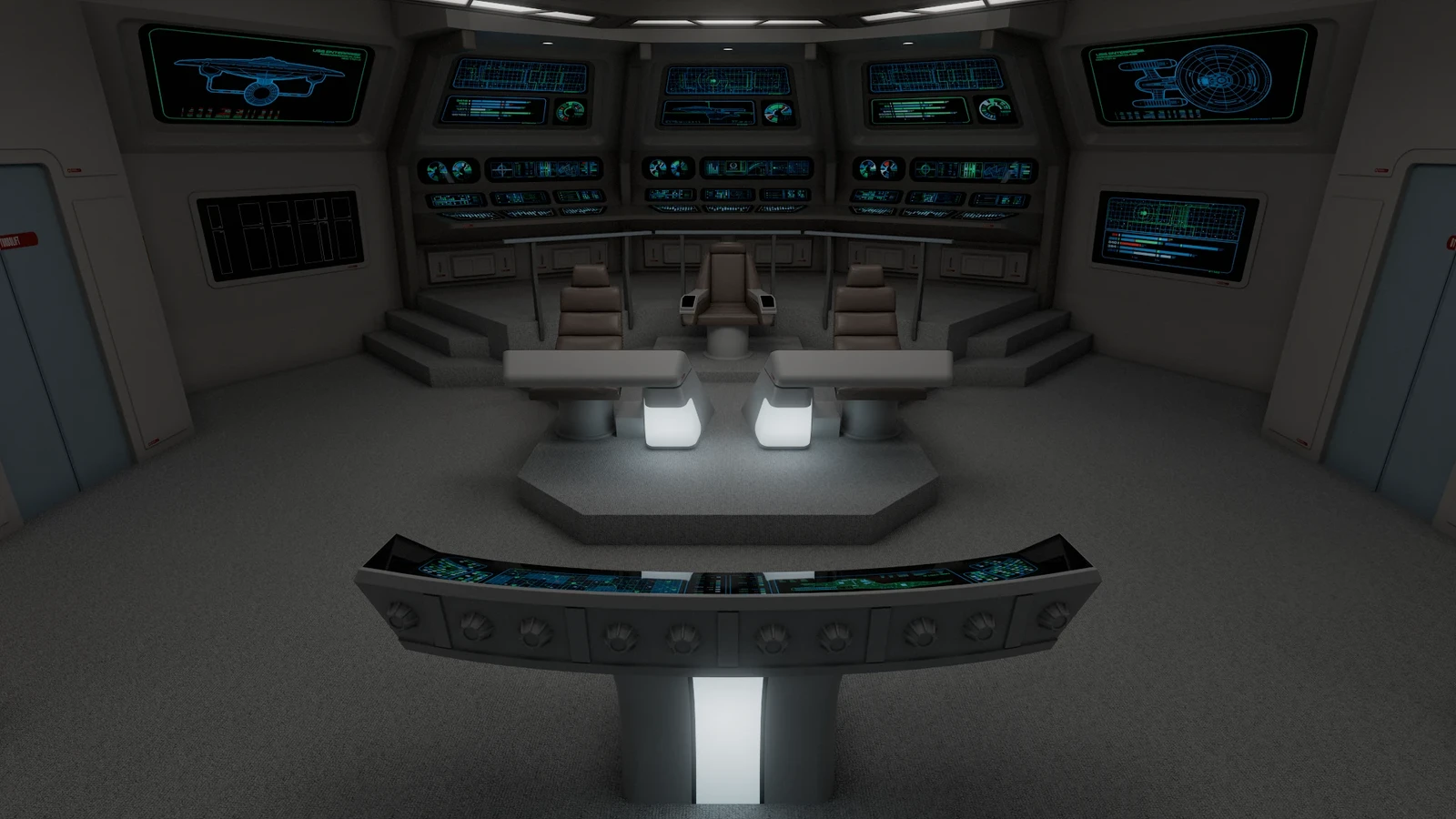 The aft wall contained three consoles, working clockwise from the viewscreen: science, engineering, and operations. In front of the captain were the flight control and tactical stations. At the very front of the bridge there was a master system display console, which could in an emergency be used to control any shipboard system, to give further redundancy to this new, more automated bridge design.
