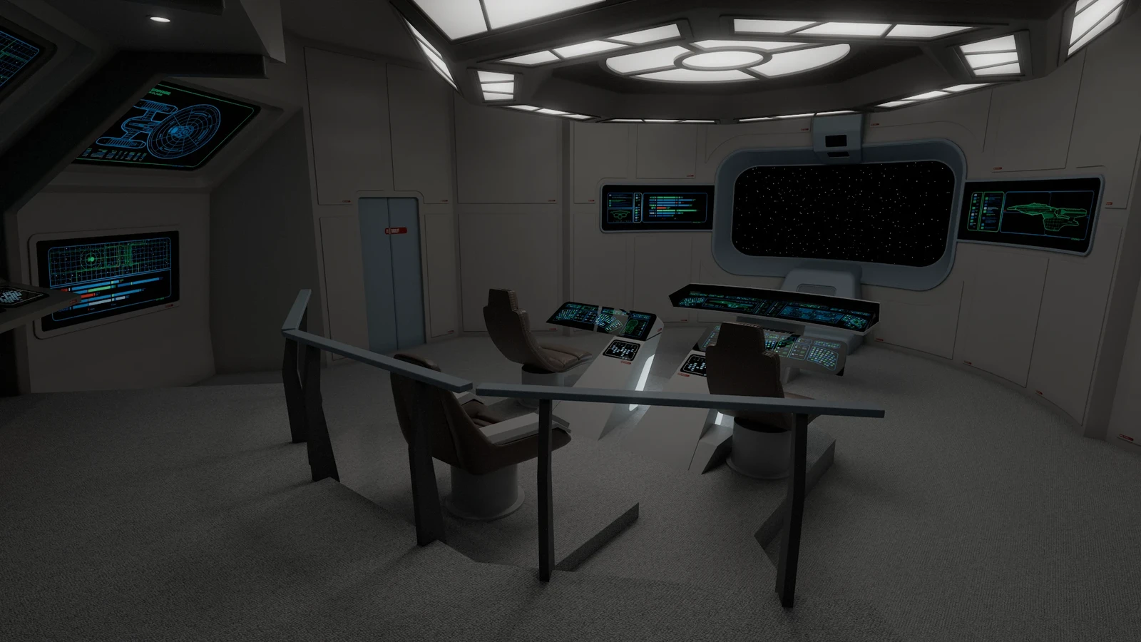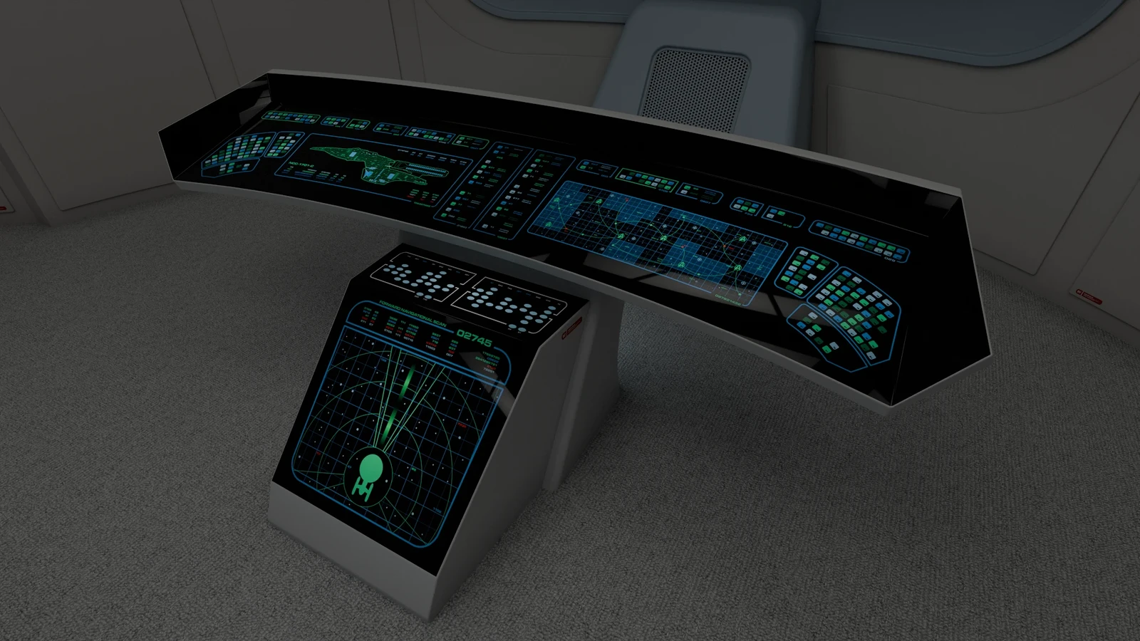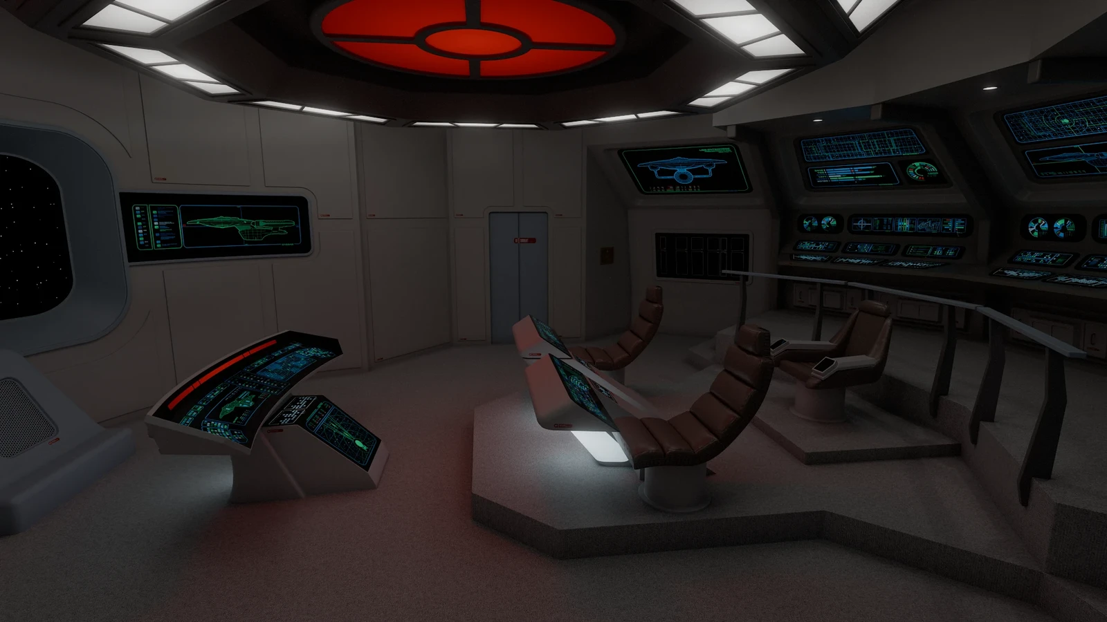 The aft wall contained three consoles, working clockwise from the viewscreen: science, engineering, and operations. In front of the captain were the flight control and tactical stations. At the very front of the bridge there was a master system display console, which could in an emergency be used to control any shipboard system, to give further redundancy to this new, more automated bridge design.