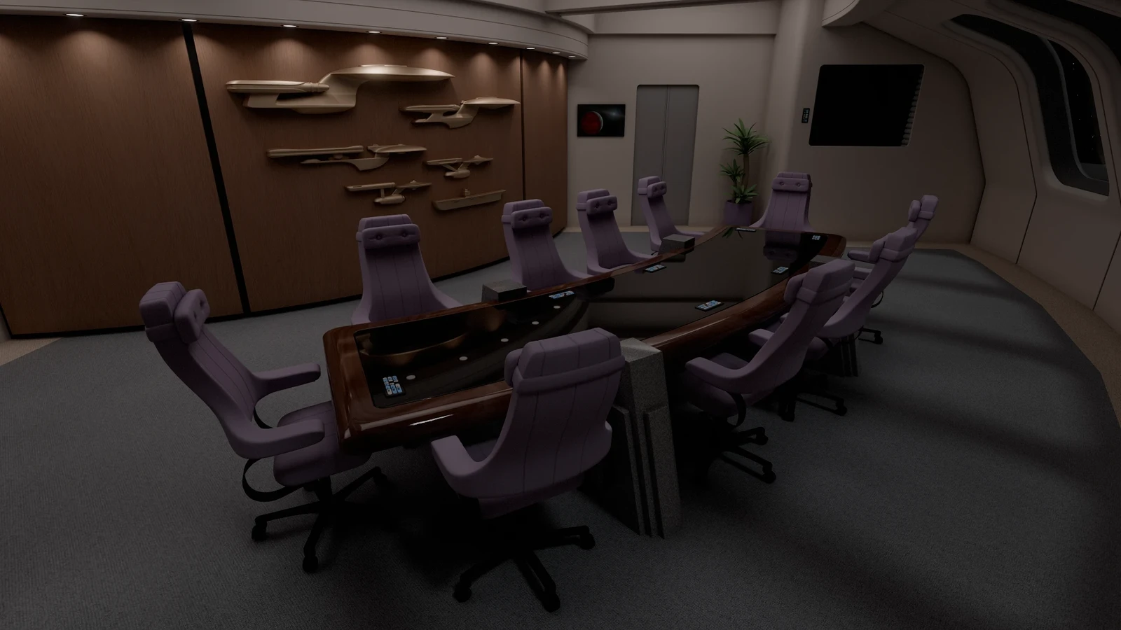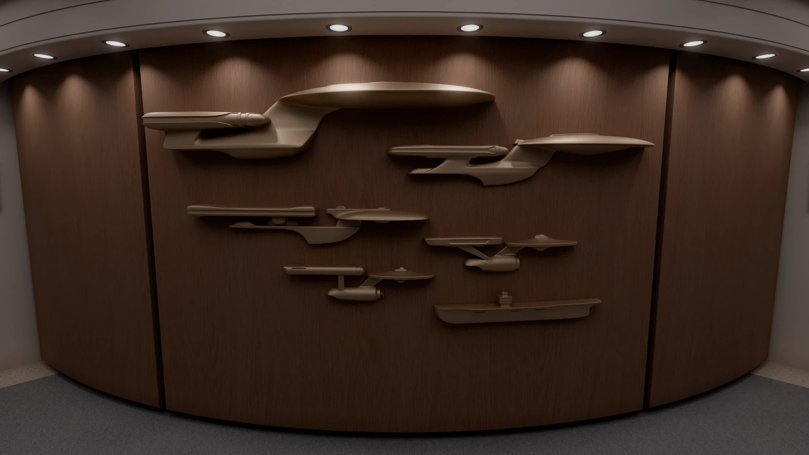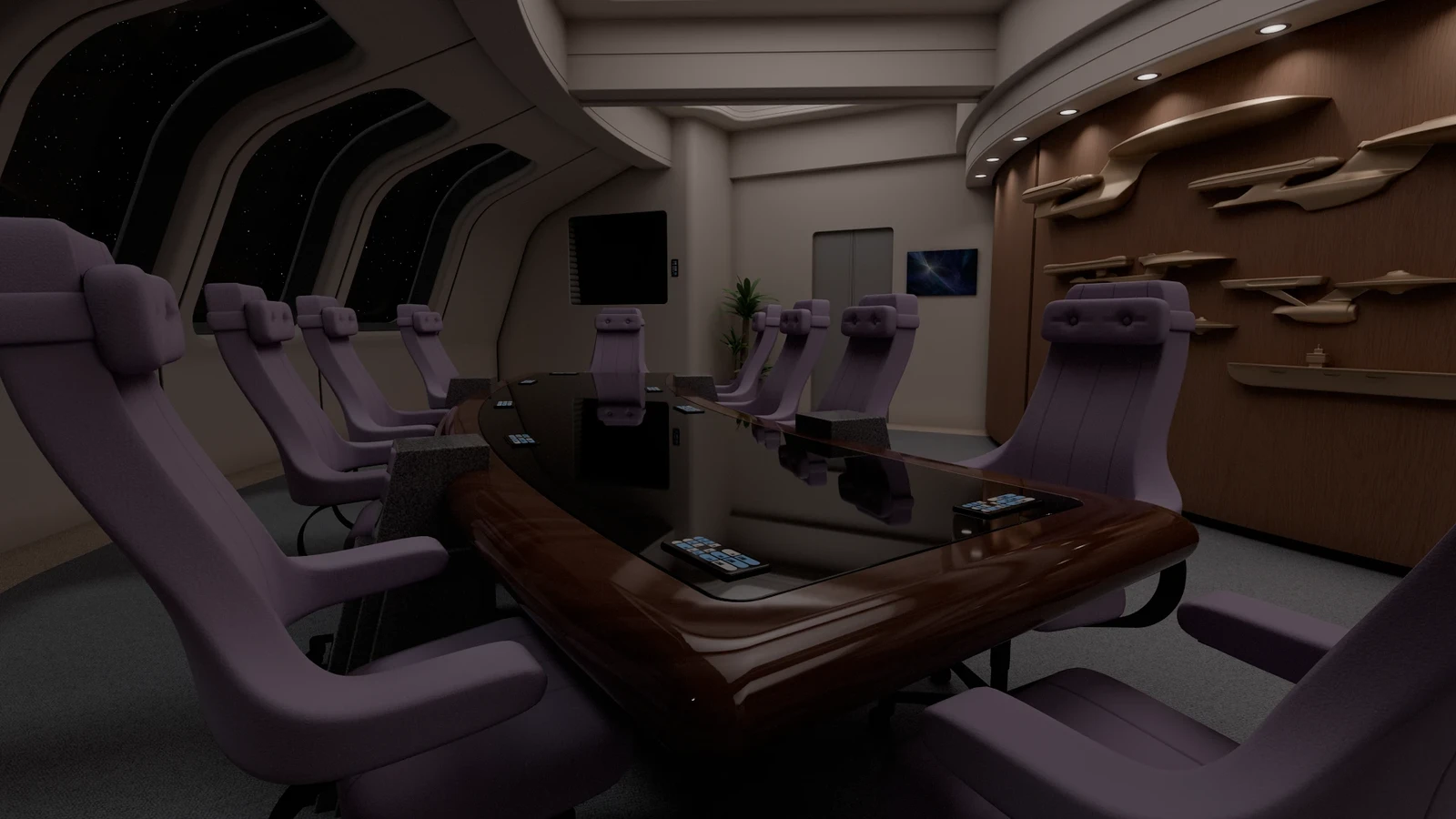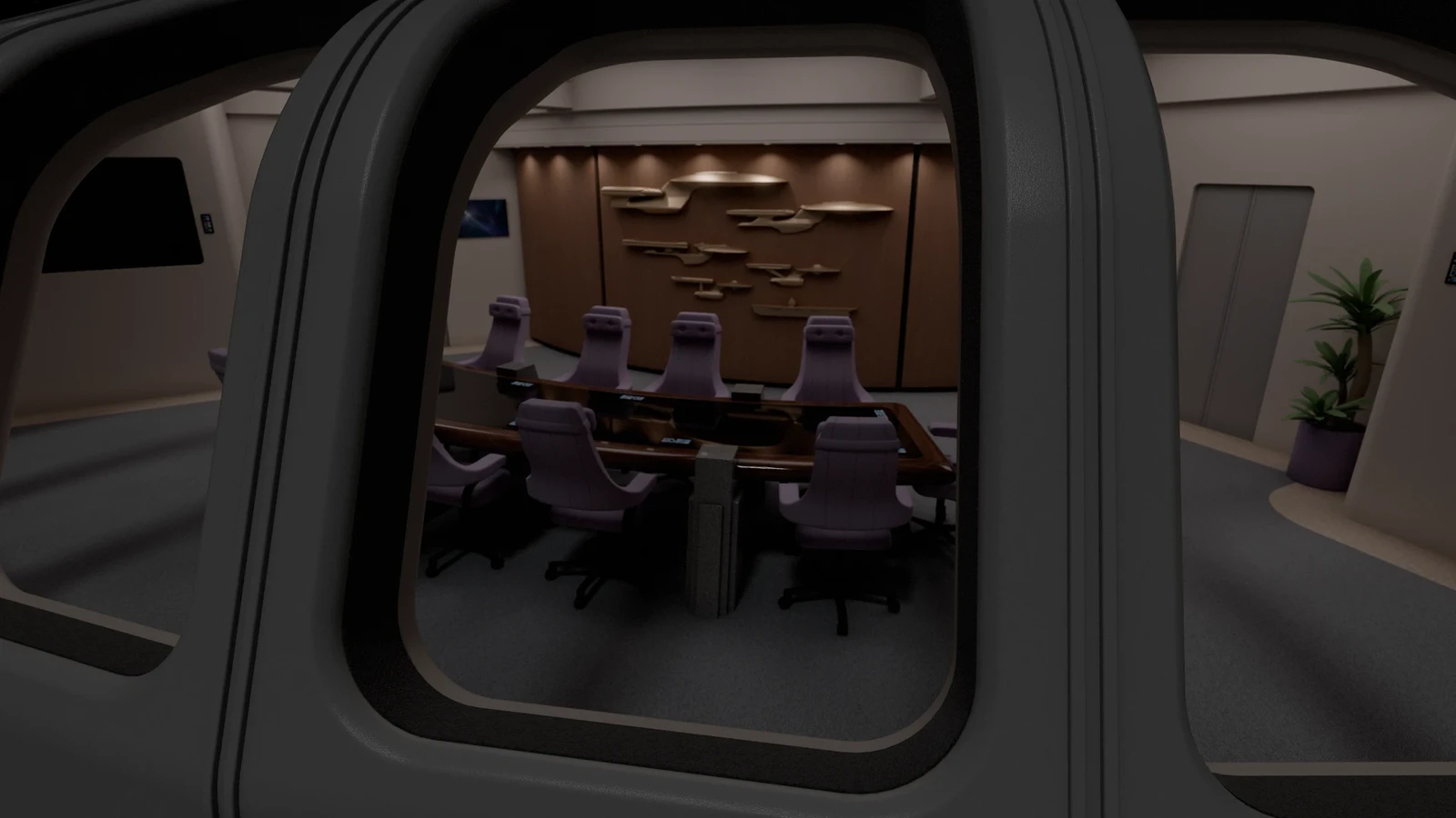 The port side door leads down into deck two, while the starboard side door leads back to the main bridge. The front wall has a decorative display of previous ships named Enterprise.