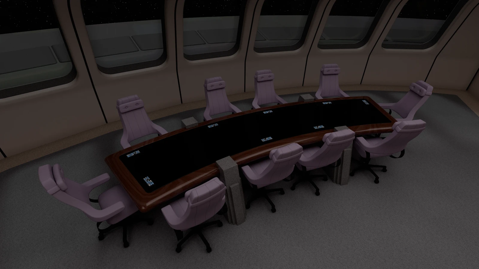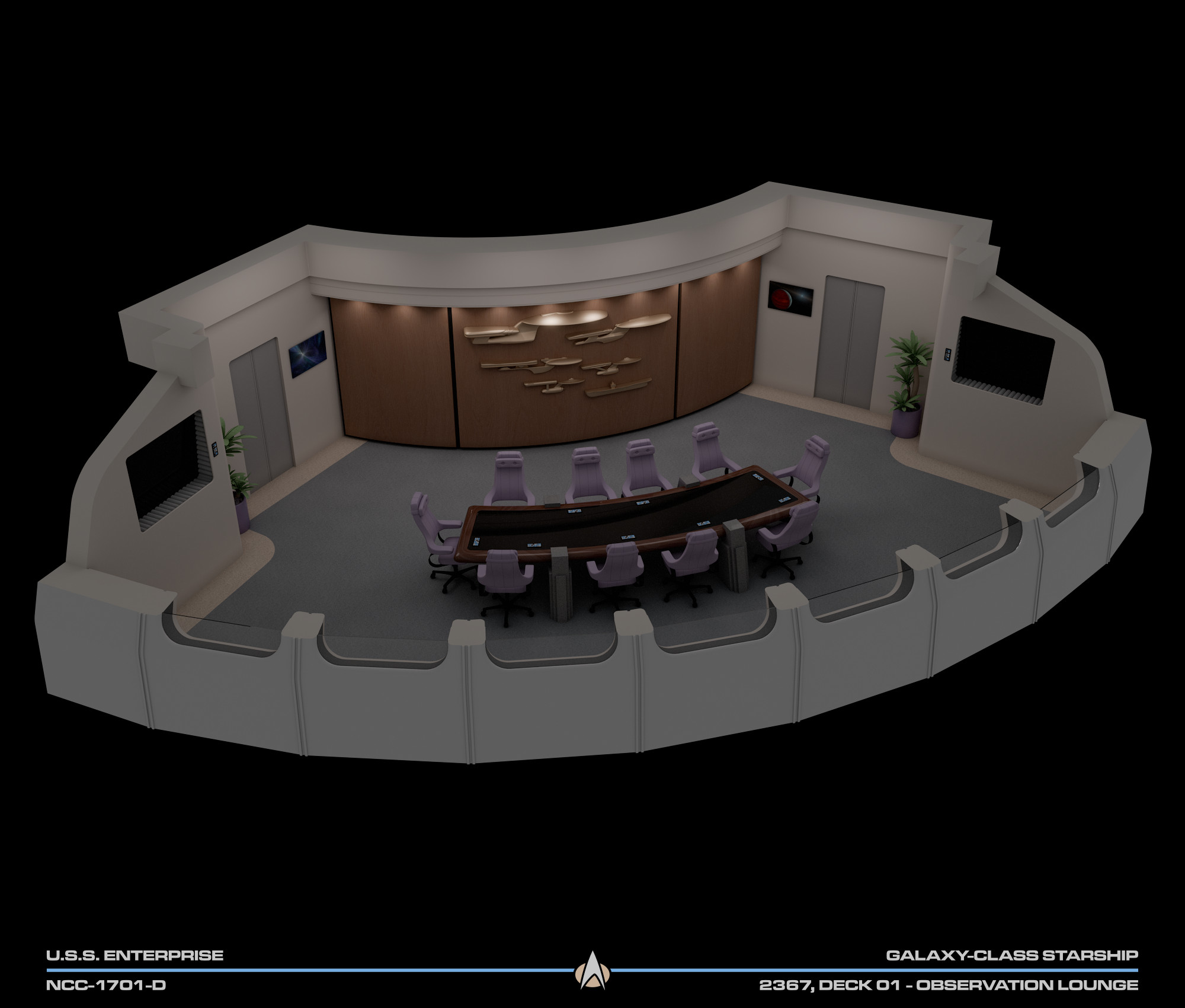 Located directly behind the bridge, the observation lounge was the main conference room for the bridge crew to discuss upcoming missions or carry on any sort of work meeting. Due to the ship's status as Federation flagship, it was also the place of diplomatic meetings with high ranking officials from other polities being hosted on board the ship.