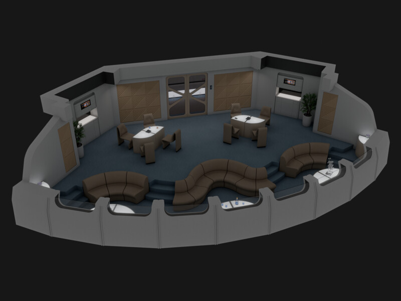 Located directly behind the bridge, the observation lounge was the main conference room for the bridge crew to discuss upcoming missions or carry on any sort of work meeting. Due to the ship's status as Federation flagship, it was also the place of diplomatic meetings with high ranking officials from other polities being hosted on board the ship.