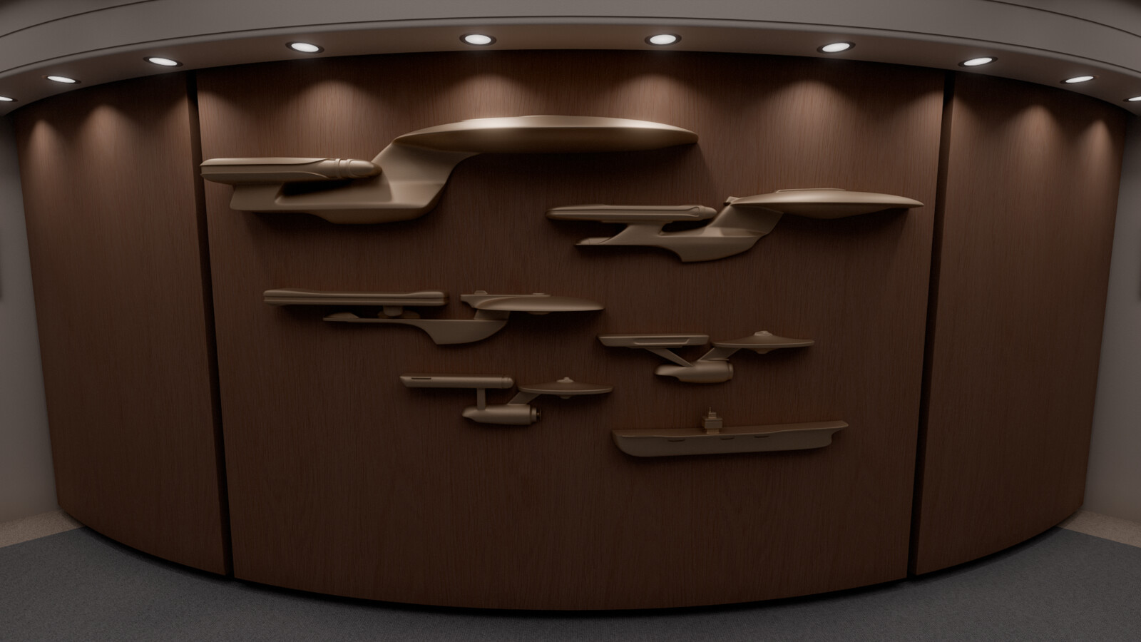 (The real life set had somewhat different looking sculptures, as the ones depicting the Enterprises B and C were different to how those ships were eventually portrayed. For this reproduction, I decided to "correct" this, as a personal prerogative, and showcase both of those ships with their "real" in-universe shapes.)