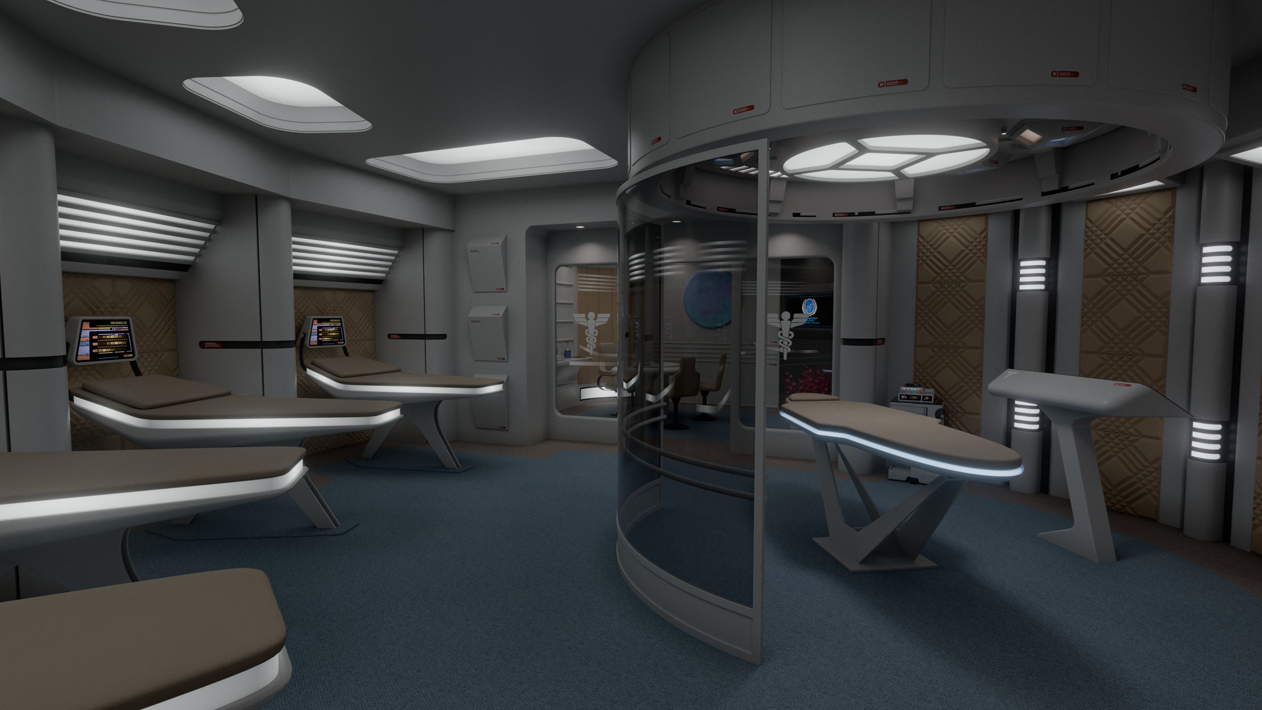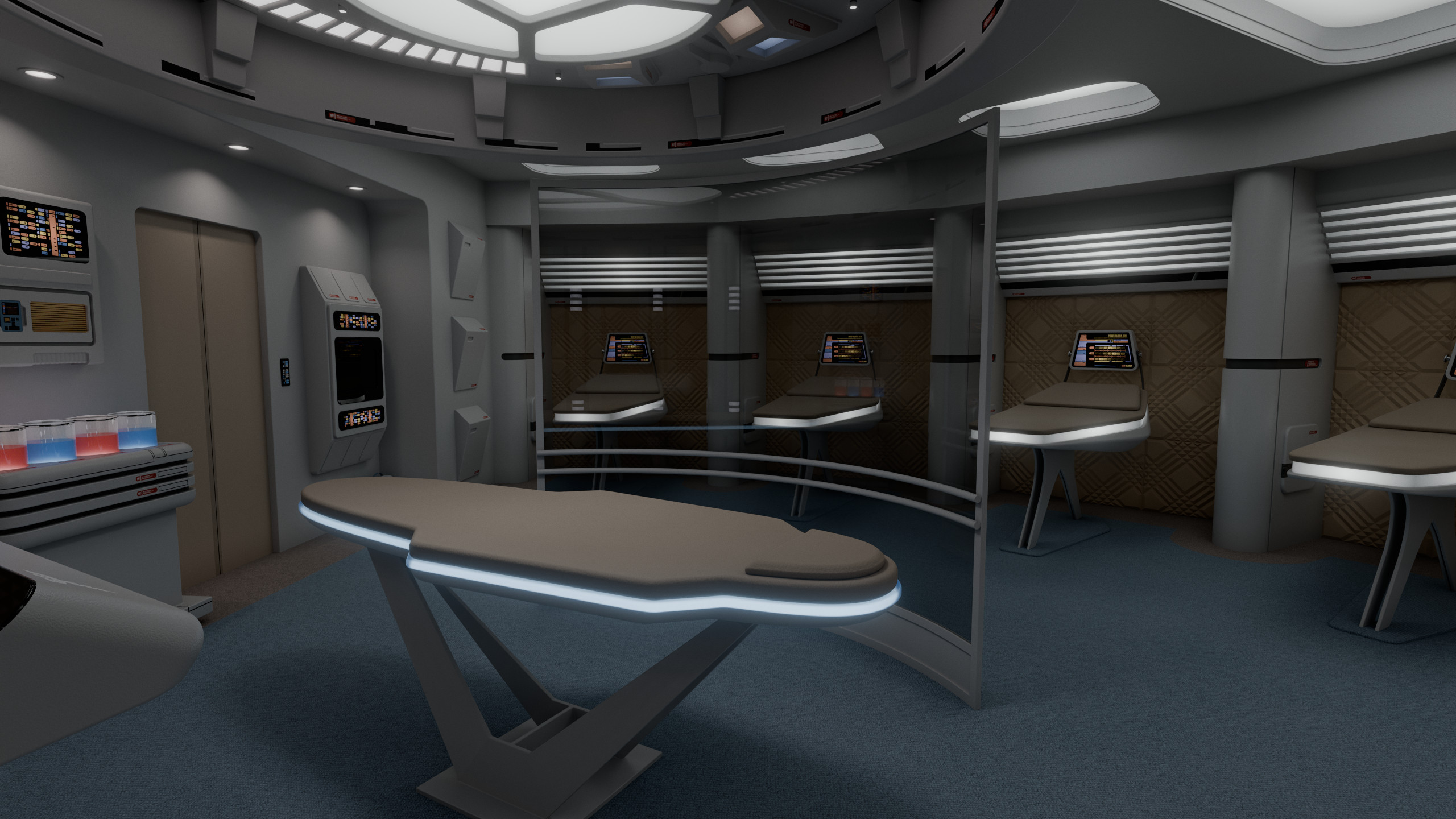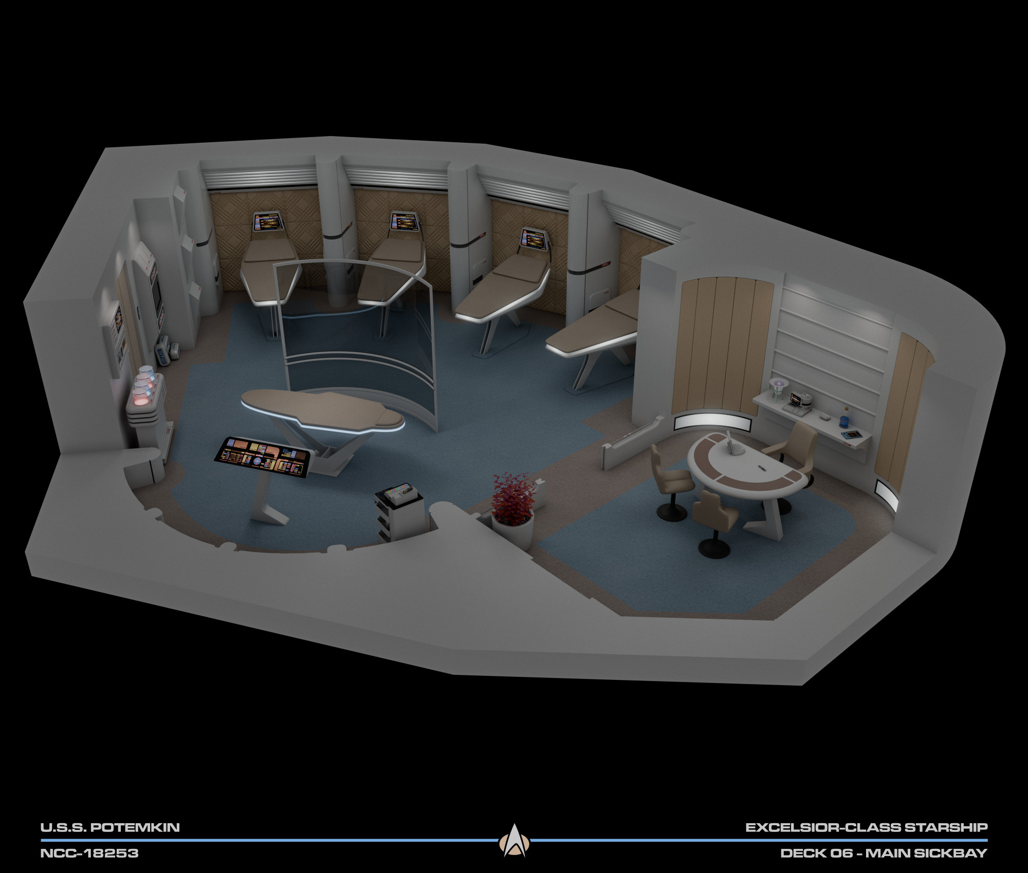 Part of a small medical complex which also includes isolation wards and surgical rooms, main sickbay was a relatively compact room with 4 biobeds for ambulatory treatment and an examination bed which could be used for light surgery. Directly connected to the room was the office of the chief medical officer. There were two entrances to the room: one through the main ward; the other through the office.