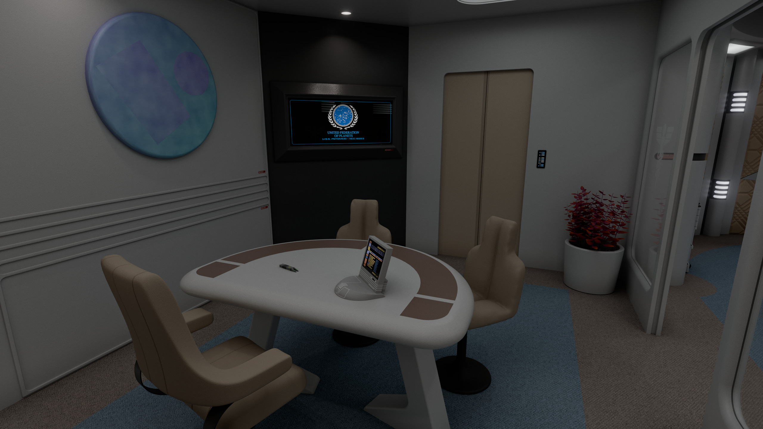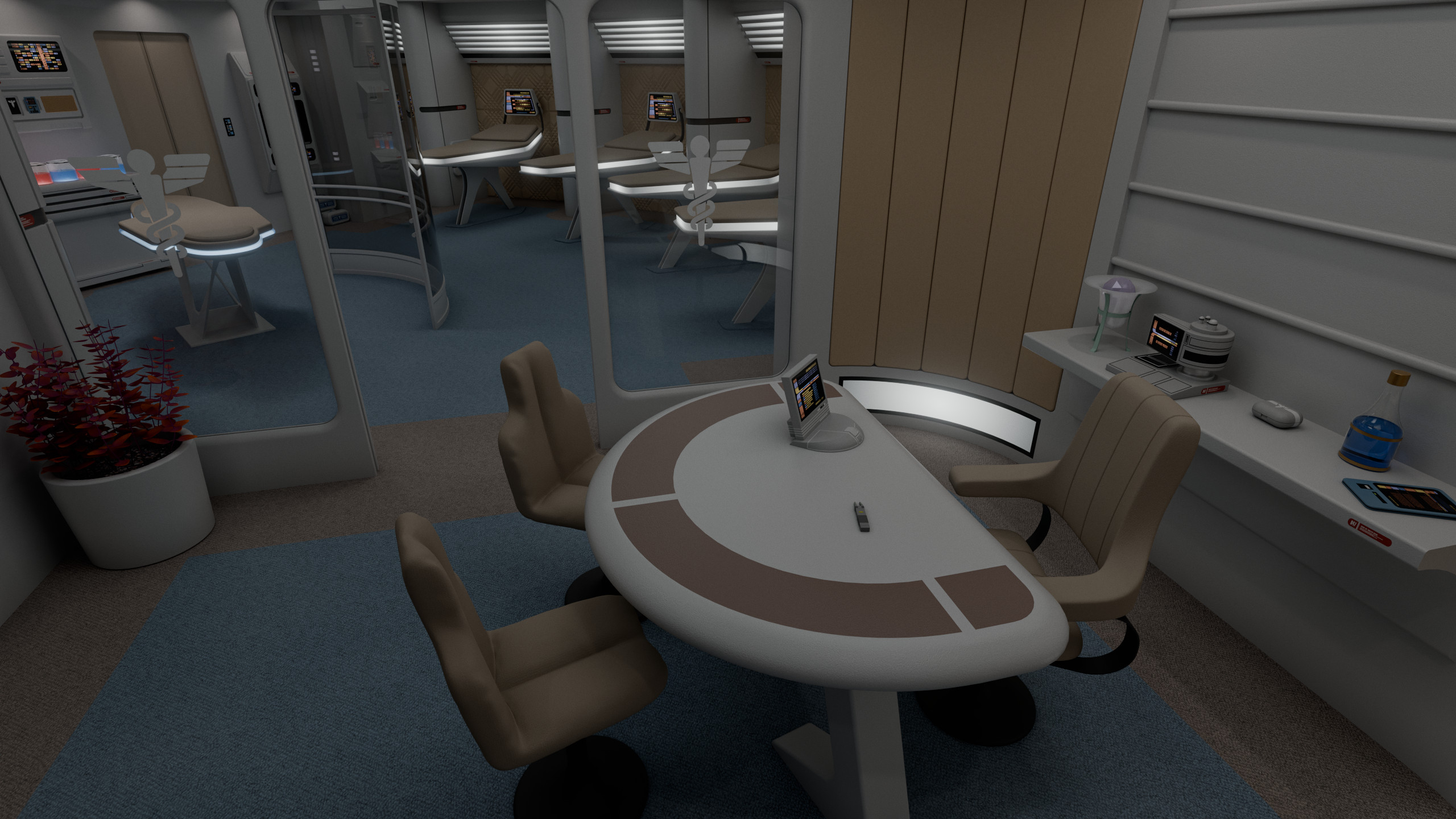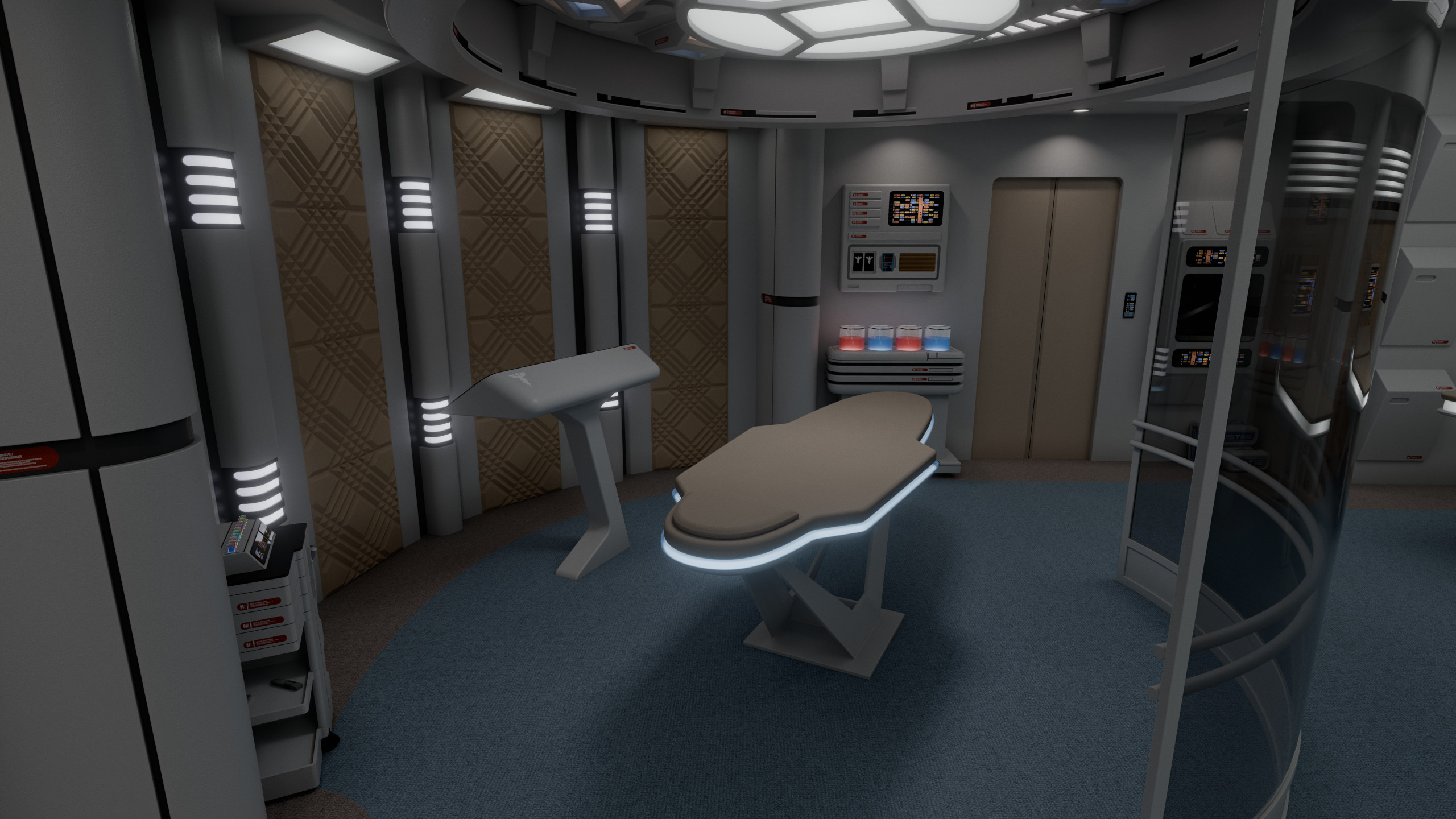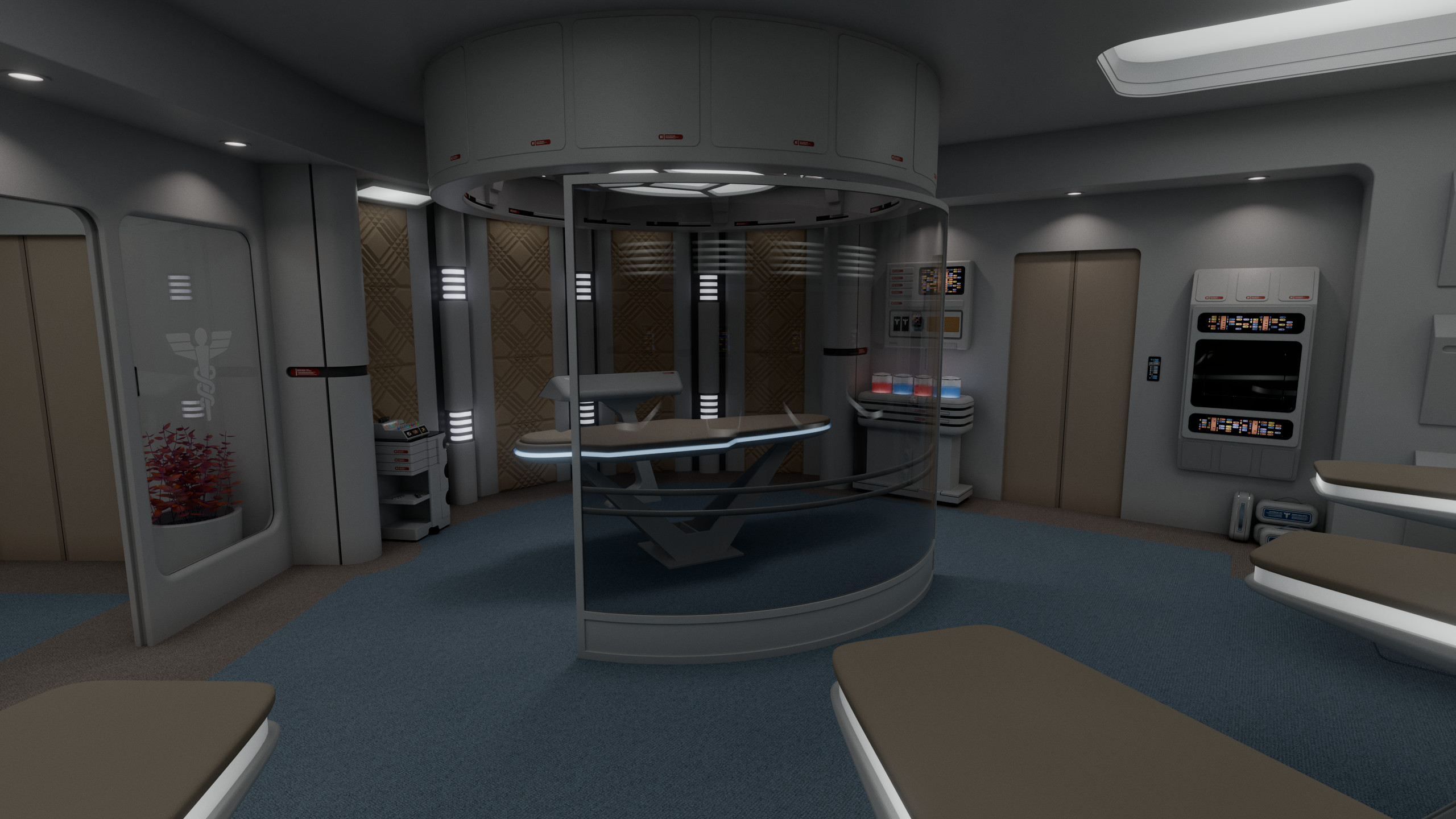 Part of a small medical complex which also includes isolation wards and surgical rooms, main sickbay was a relatively compact room with 4 biobeds for ambulatory treatment and an examination bed which could be used for light surgery. Directly connected to the room was the office of the chief medical officer. There were two entrances to the room: one through the main ward; the other through the office.