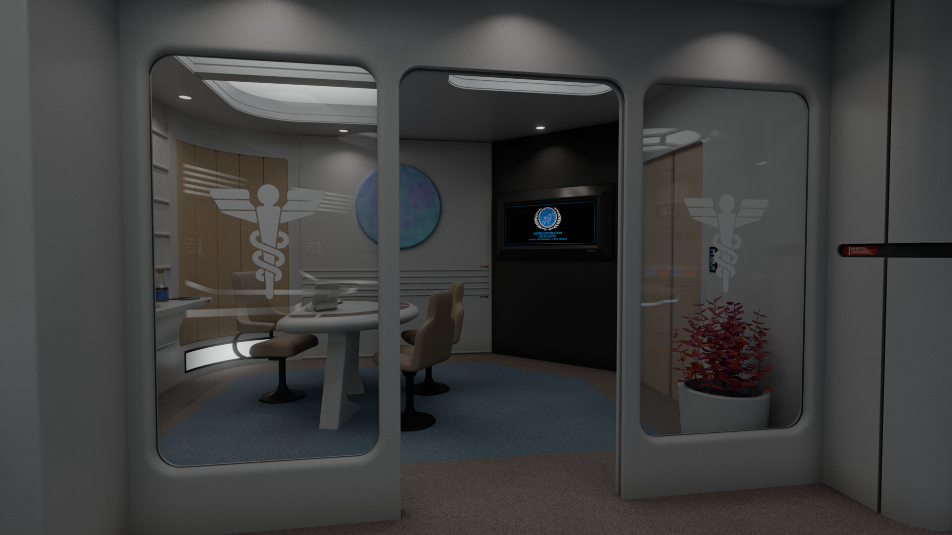 Part of a small medical complex which also includes isolation wards and surgical rooms, main sickbay was a relatively compact room with 4 biobeds for ambulatory treatment and an examination bed which could be used for light surgery. Directly connected to the room was the office of the chief medical officer. There were two entrances to the room: one through the main ward; the other through the office.