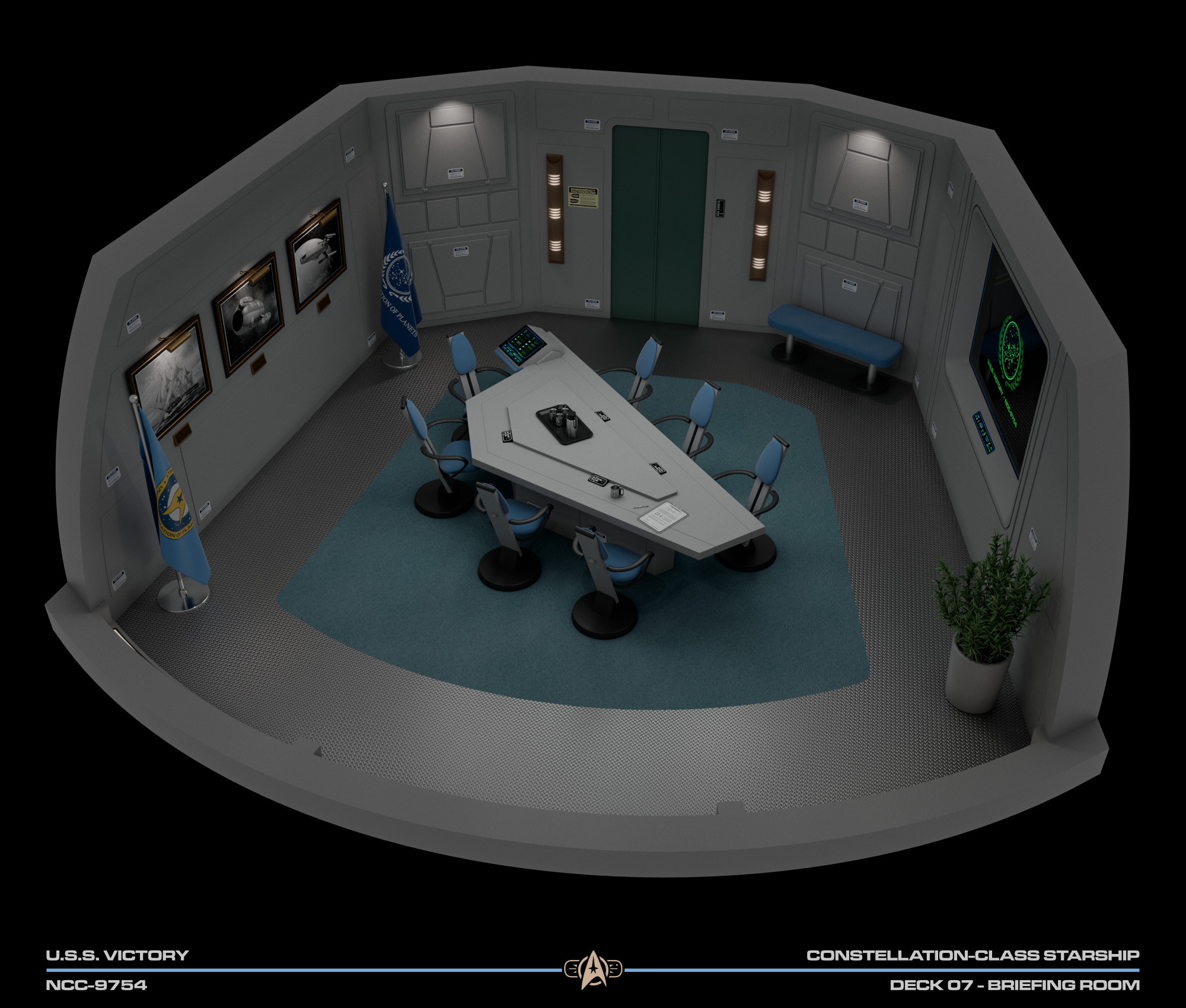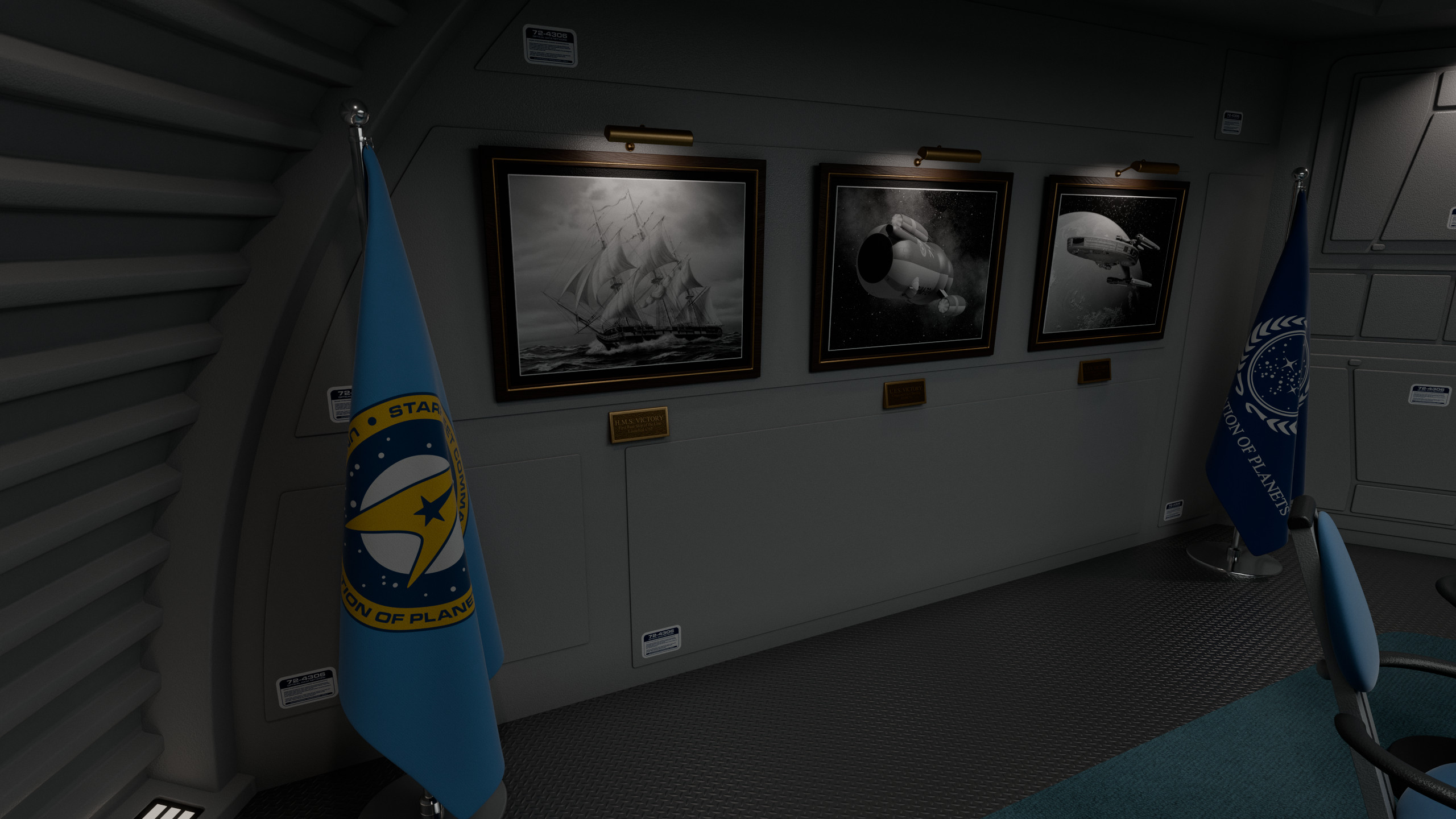 The other side wall has three framed paintings depicting the Victory ship lineage: the original HMS Victory; the United Earth UES Victory; and the USS Victory which this room belongs to. Flanking the paintings were two flags, one for the United Federation of Planets and the other for Starfleet Command.