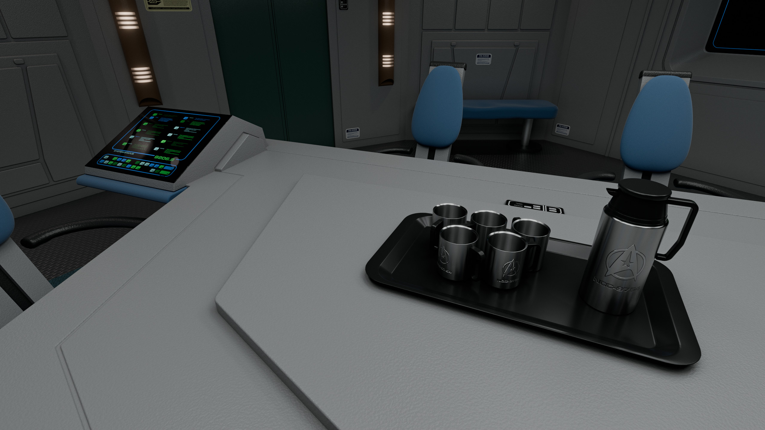 Located near the center of the ship, the briefing room was a secure location for the crew to discuss missions or general matters of importance. With a design common in this sort of room since the mid-23rd century, a large table occupies the center of the space, featuring a computer terminal at one end which operates a large screen on the opposite wall.