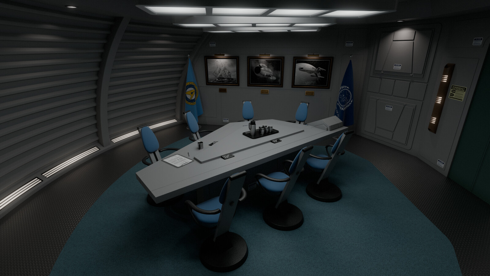 Located near the center of the ship, the briefing room was a secure location for the crew to discuss missions or general matters of importance. With a design common in this sort of room since the mid-23rd century, a large table occupies the center of the space, featuring a computer terminal at one end which operates a large screen on the opposite wall.
