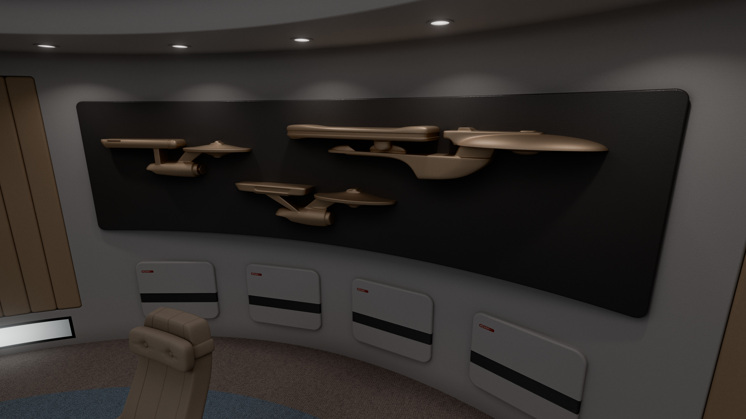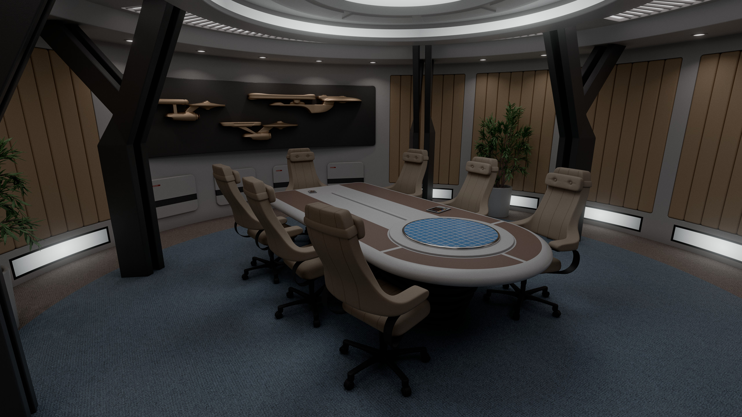 A no-nonsense room for the bridge crew to have important meetings in, the Potemkin briefing room featured both a large viewscreen and a tabletop holo-projector for presentations. On the opposite end of the room there was a large decorative piece featuring USS Potemkin alongside the previous starship Potemkin (NCC-1657), in both its original and refit configurations.