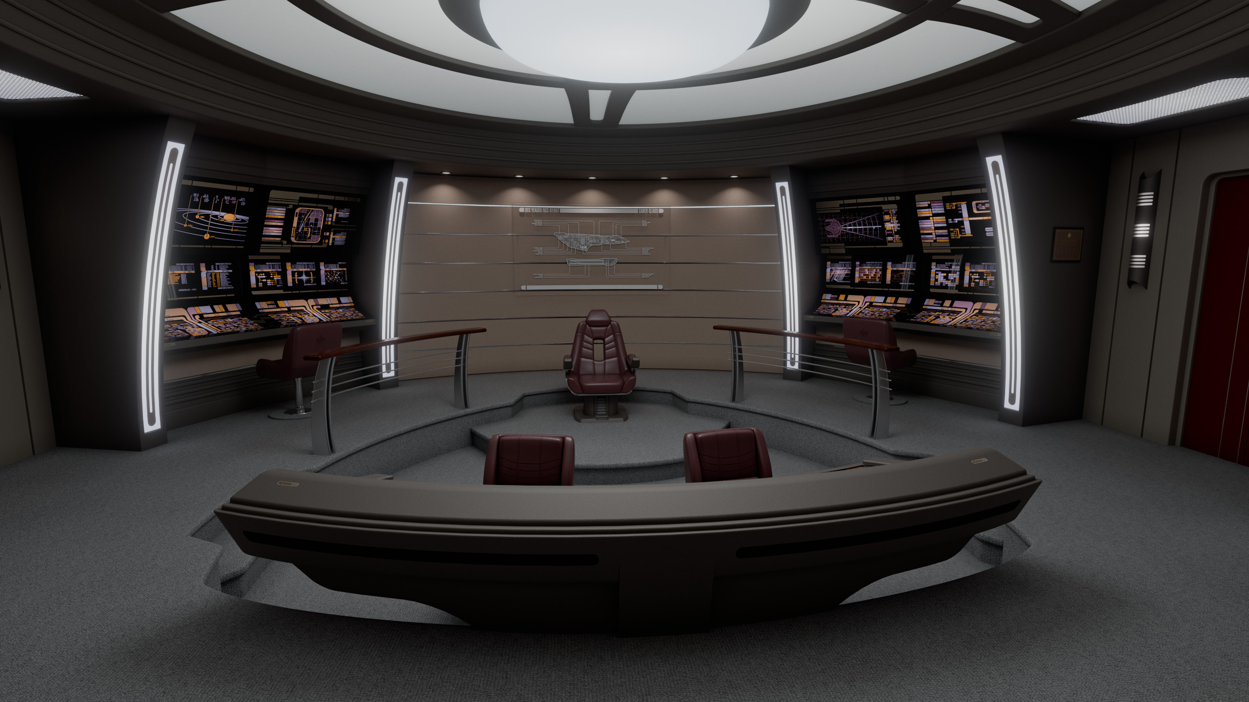 A very compact room with only 6 control stations, Yeager's bridge had a simple, no-nonsense layout fitting for a small patrol ship. The four perimeter stations were, working clockwise from the viewscreen: environment, science, engineering and mission ops. The center of the room featured a combined flight control and tactical console in a lower platform, while the captain's chair sat near the back of the room, with a view of the whole bridge.
