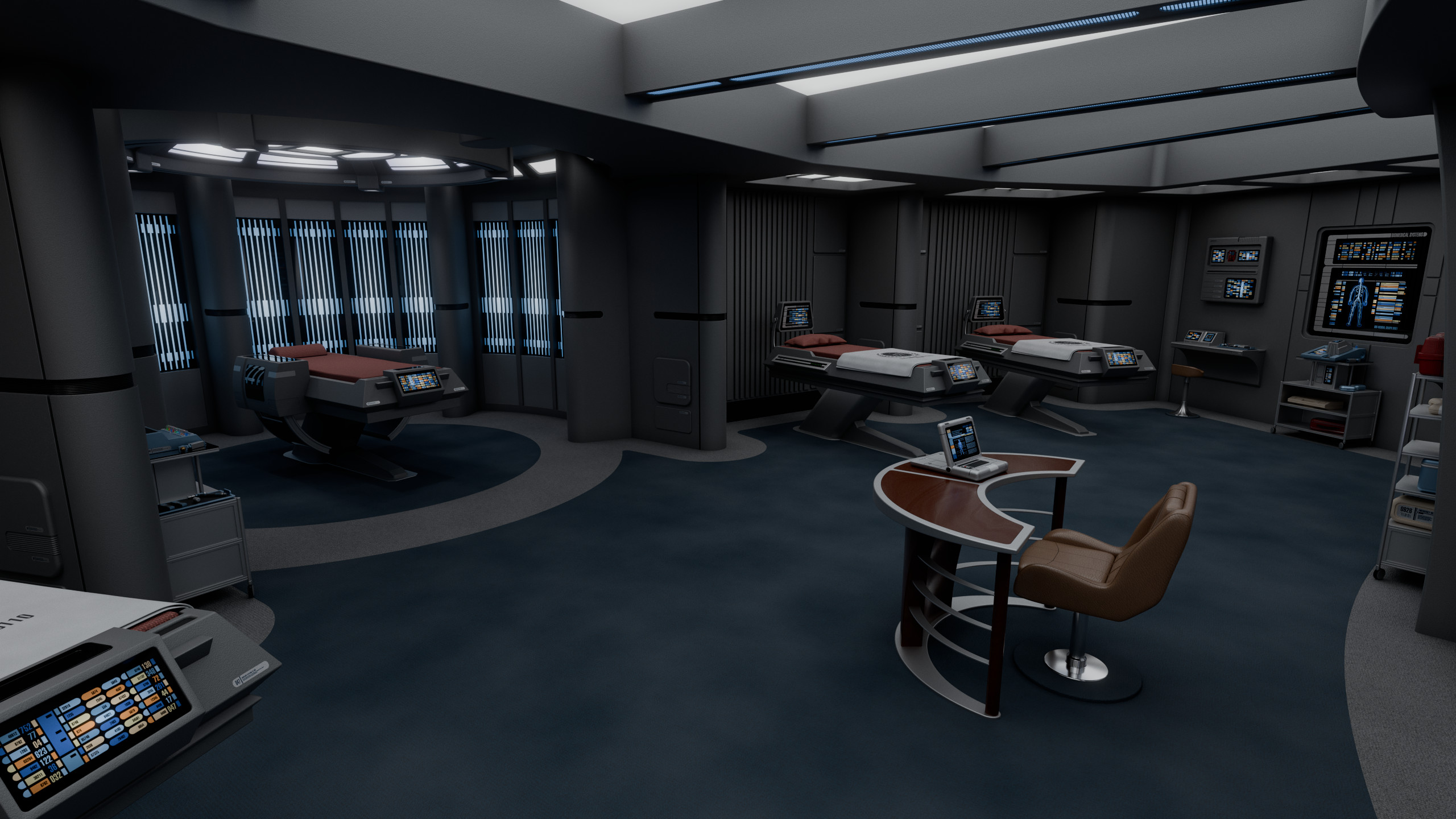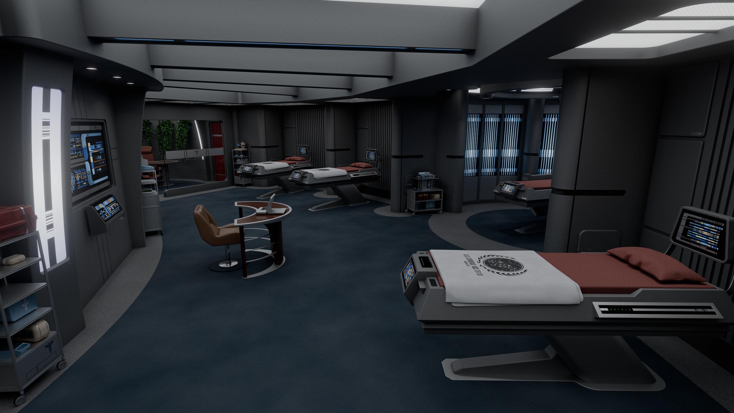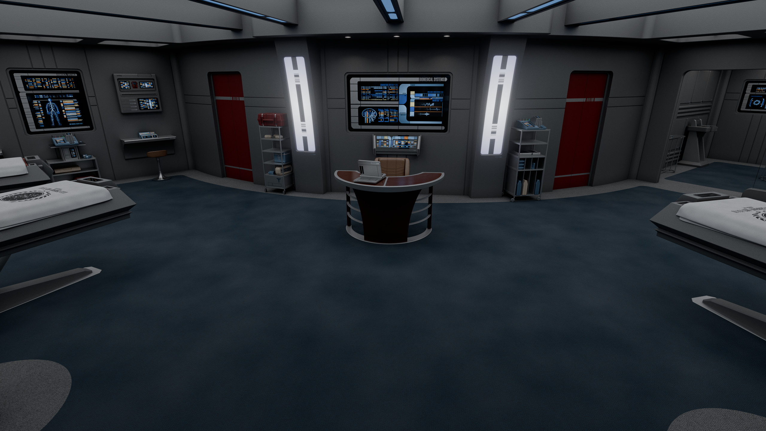 The main ward featured four standard biobeds and an integrated surgical bay. A nurse station sat at the center of the room, in front of a large display which could showcase whatever medical information the staff required. The port side of the room had a small laboratory area, with two workstations and various medical devices on hand. On the starboard side there was the office for the chief medical officer, which connected to other areas of the medical complex through a dedicated door.
