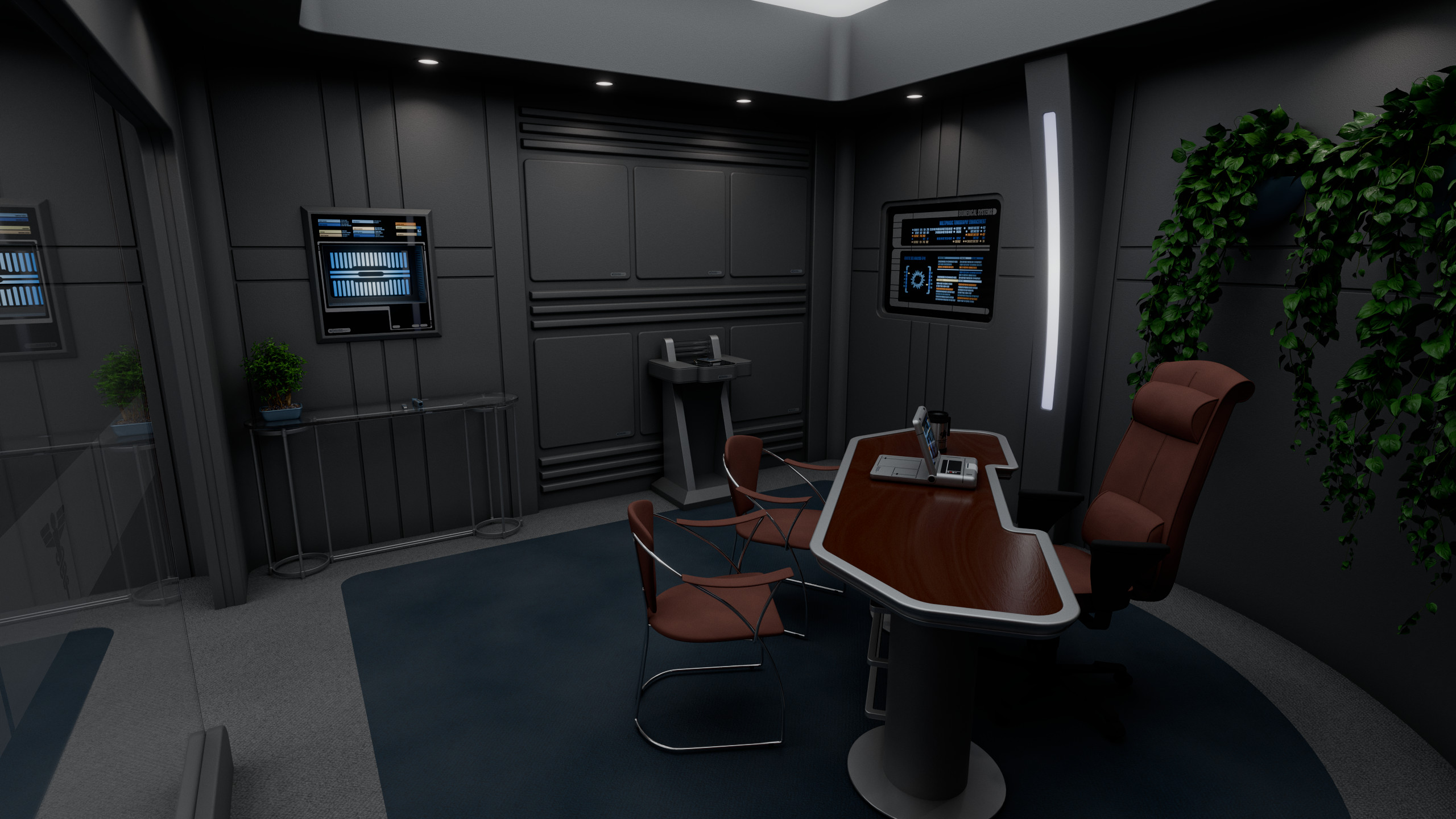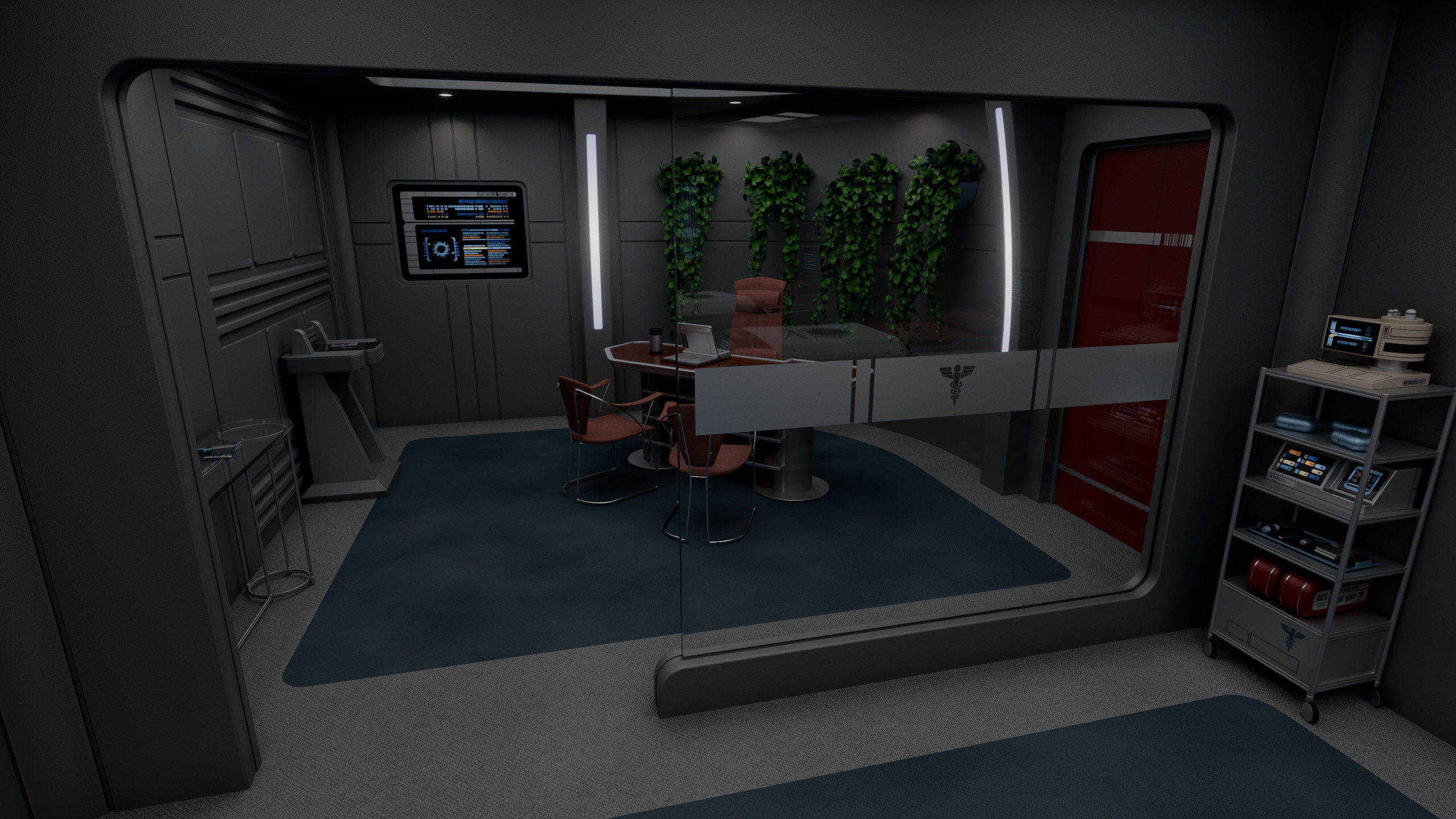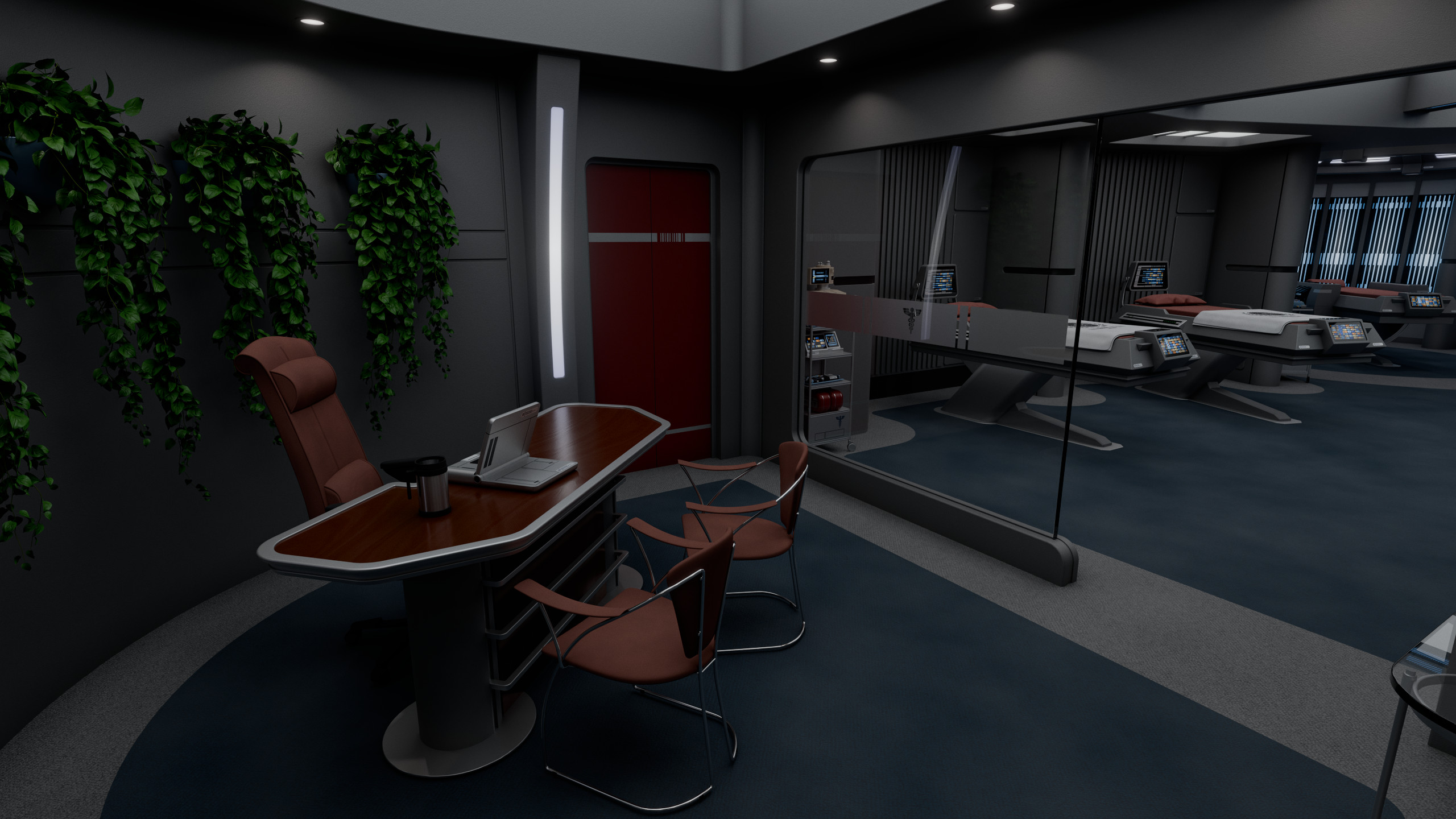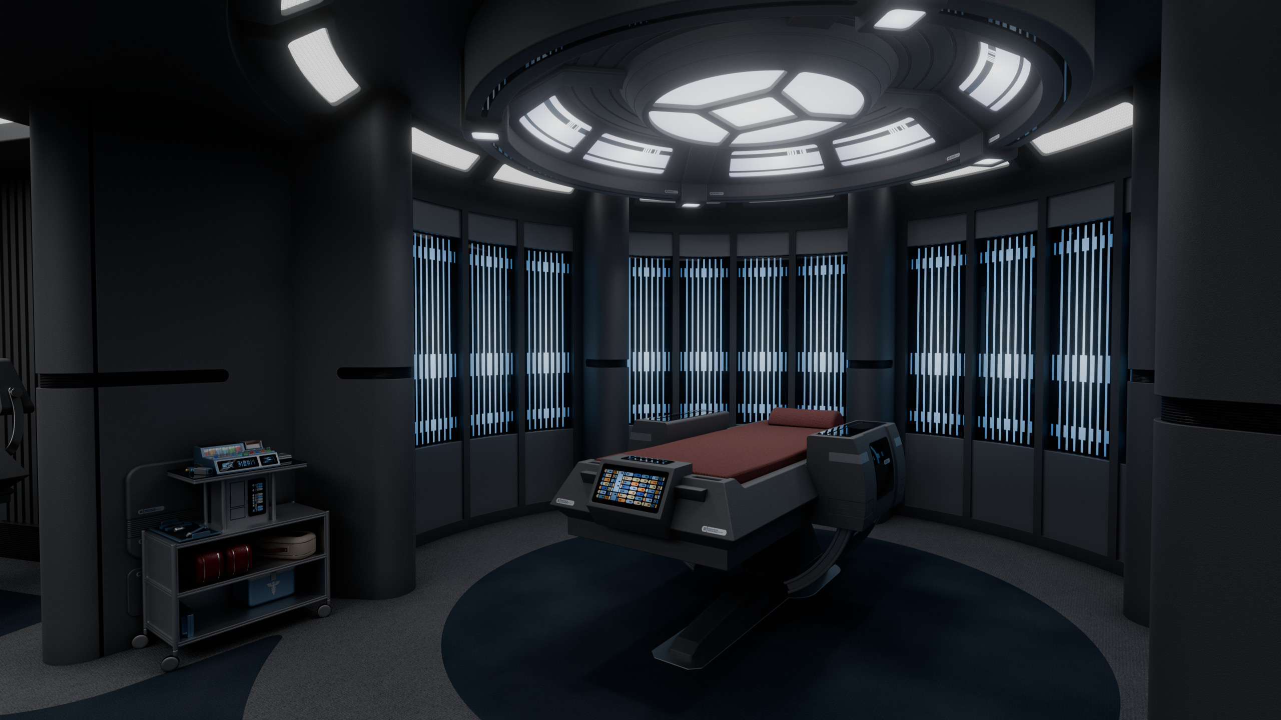 The main ward featured four standard biobeds and an integrated surgical bay. A nurse station sat at the center of the room, in front of a large display which could showcase whatever medical information the staff required. The port side of the room had a small laboratory area, with two workstations and various medical devices on hand. On the starboard side there was the office for the chief medical officer, which connected to other areas of the medical complex through a dedicated door.