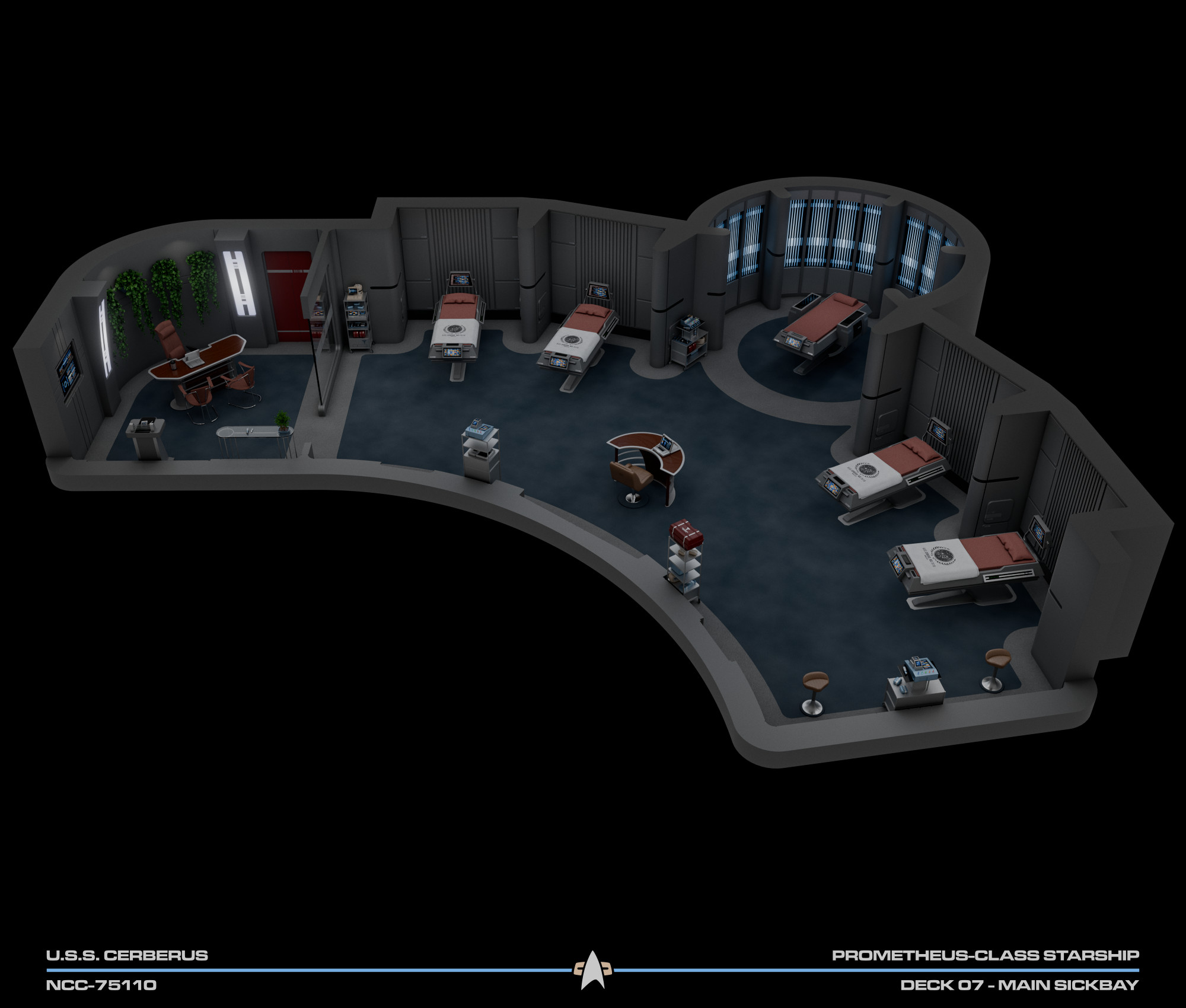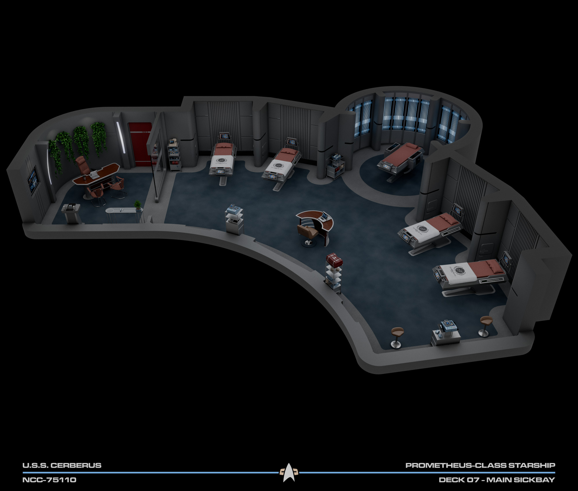 While the Prometheus prototype spaceframe featured an experimental decentralized sickbay layout, deemed necessary due to the ship’s separation capabilities, Cerberus was equipped with a larger, more traditional medical complex. Given the ship’s planned war-time role as an admiral’s flagship, it was fully equipped with a large variety of medical equipment, redundant medical wards, and extra personnel to attend as efficiently as possible to the expected battle casualties.