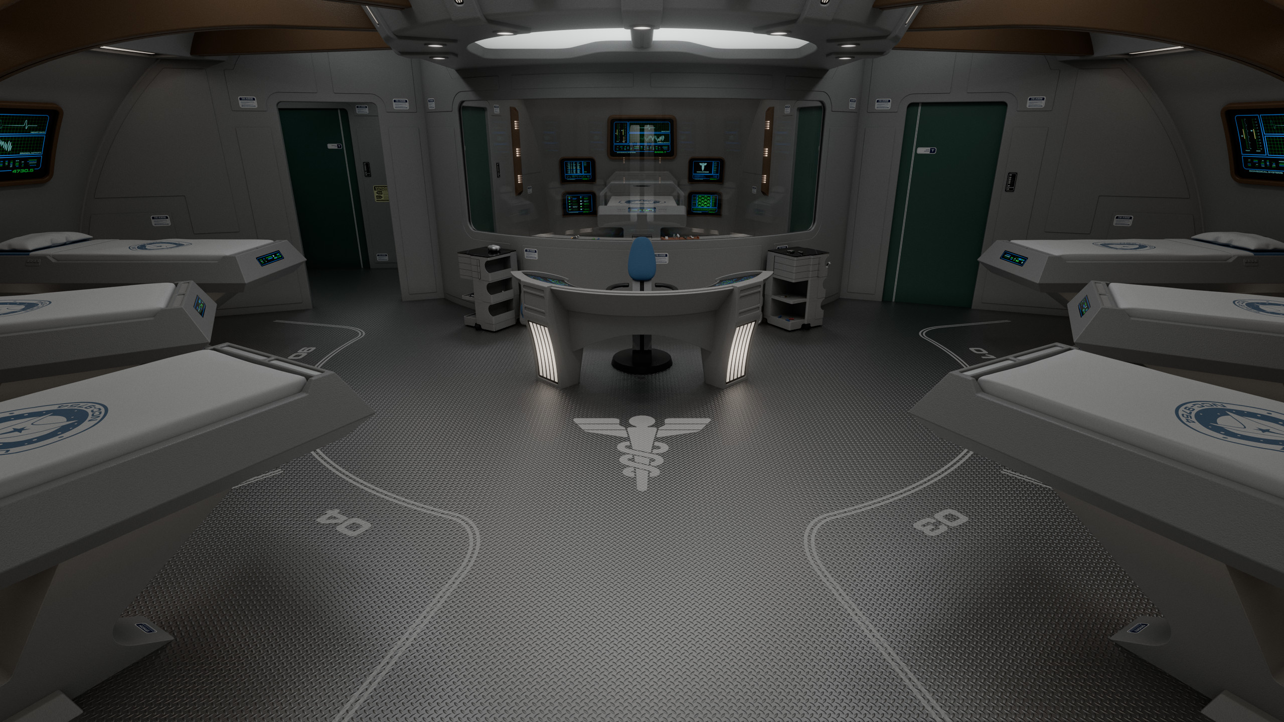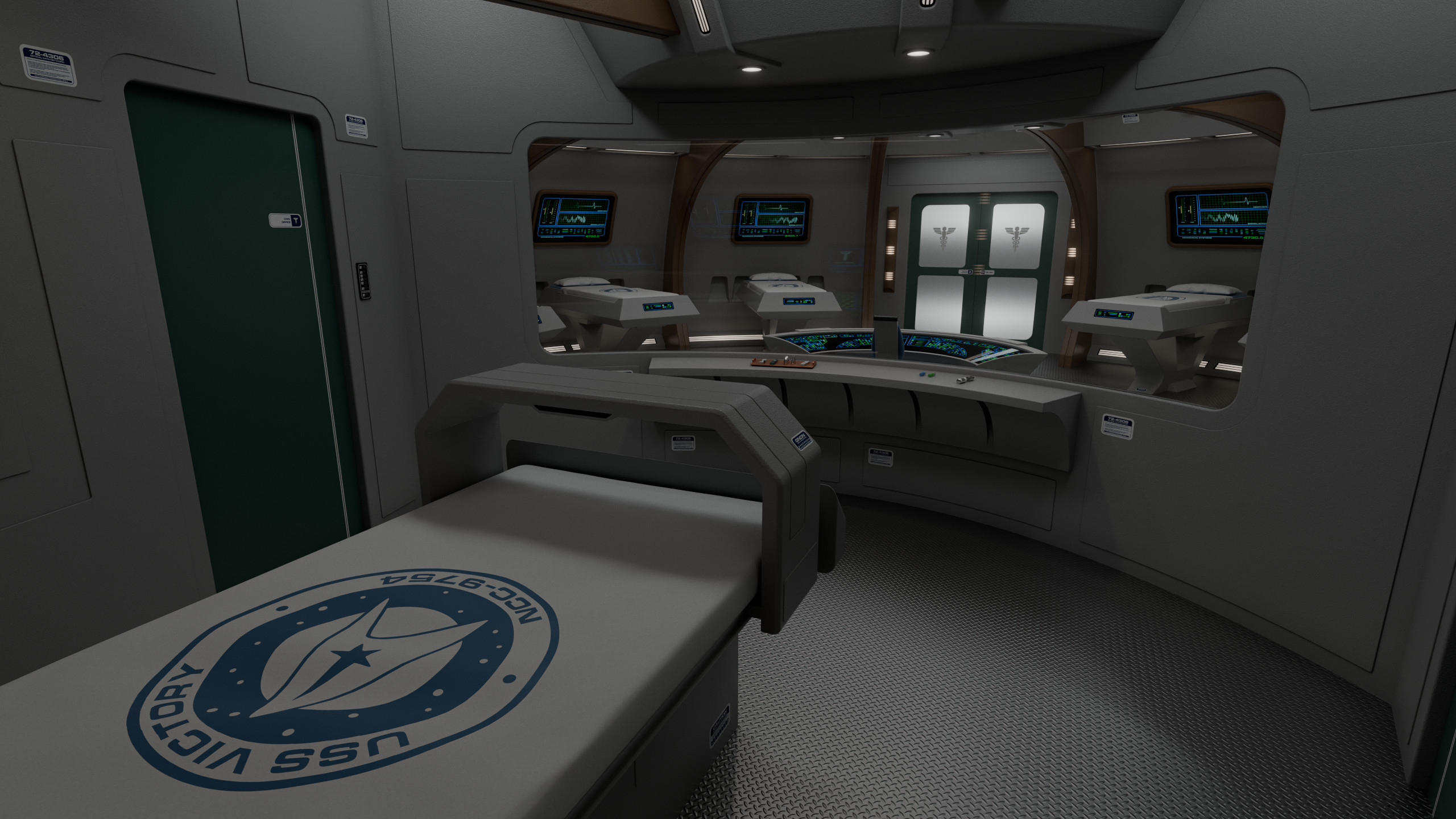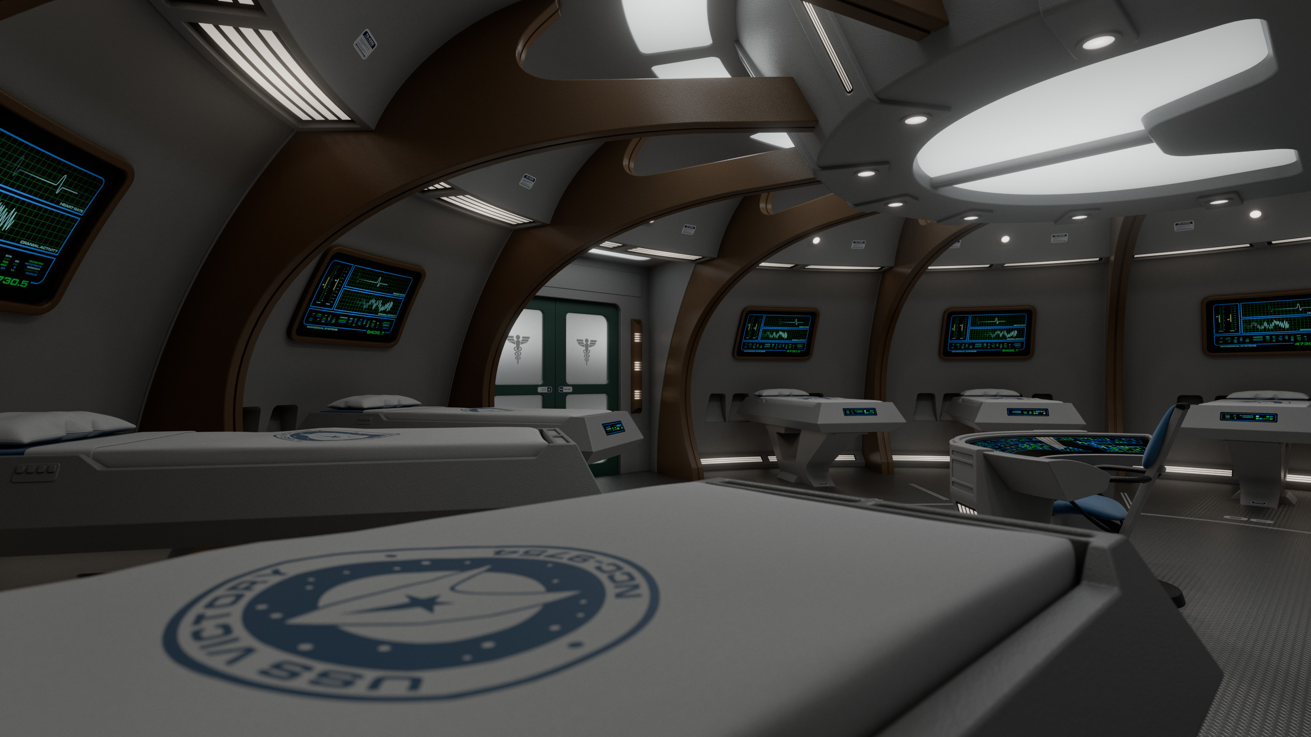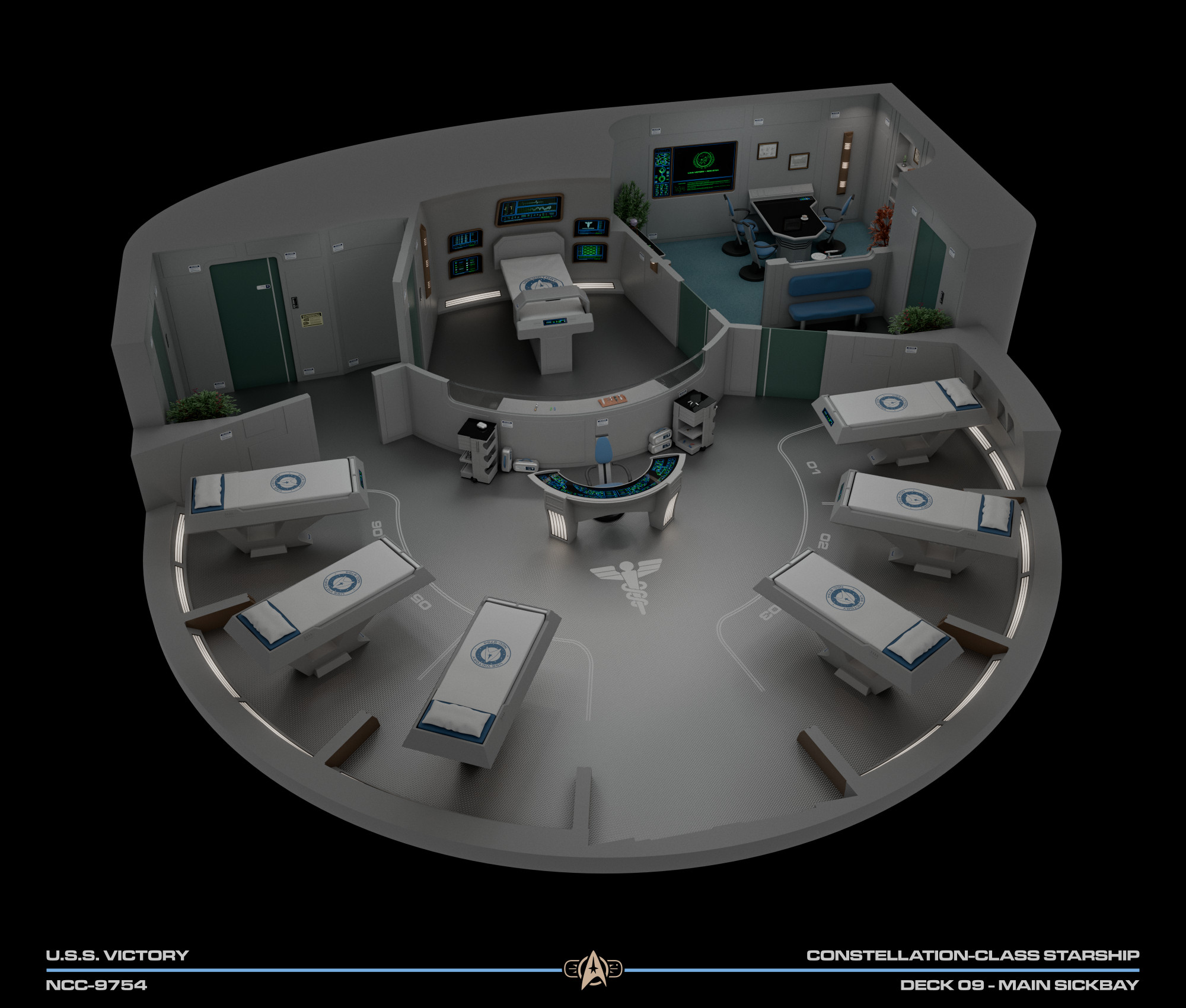 Featuring a relatively unorthodox circular design, sickbay was separated into 3 areas: the main ward, which occupies more than half the circular space; a small examination room; and the office of the chief medical officer.