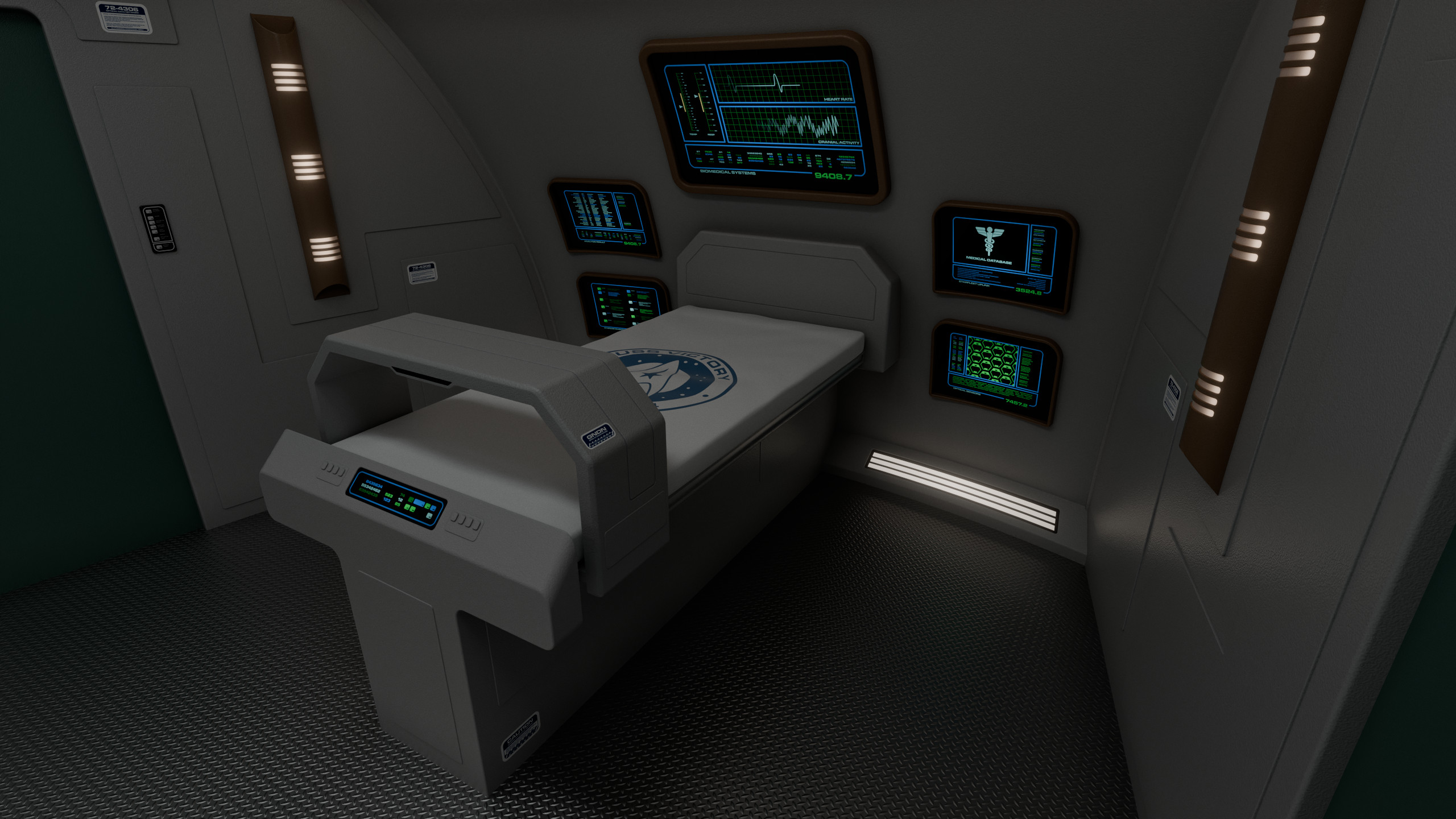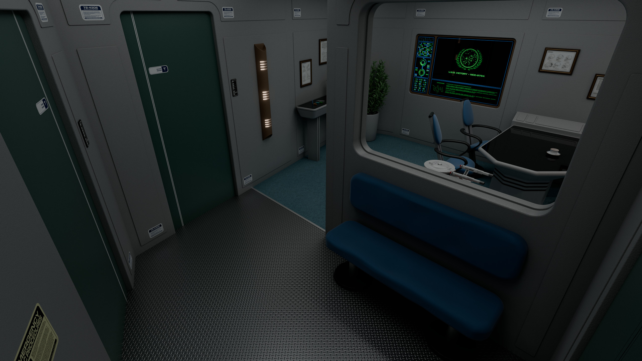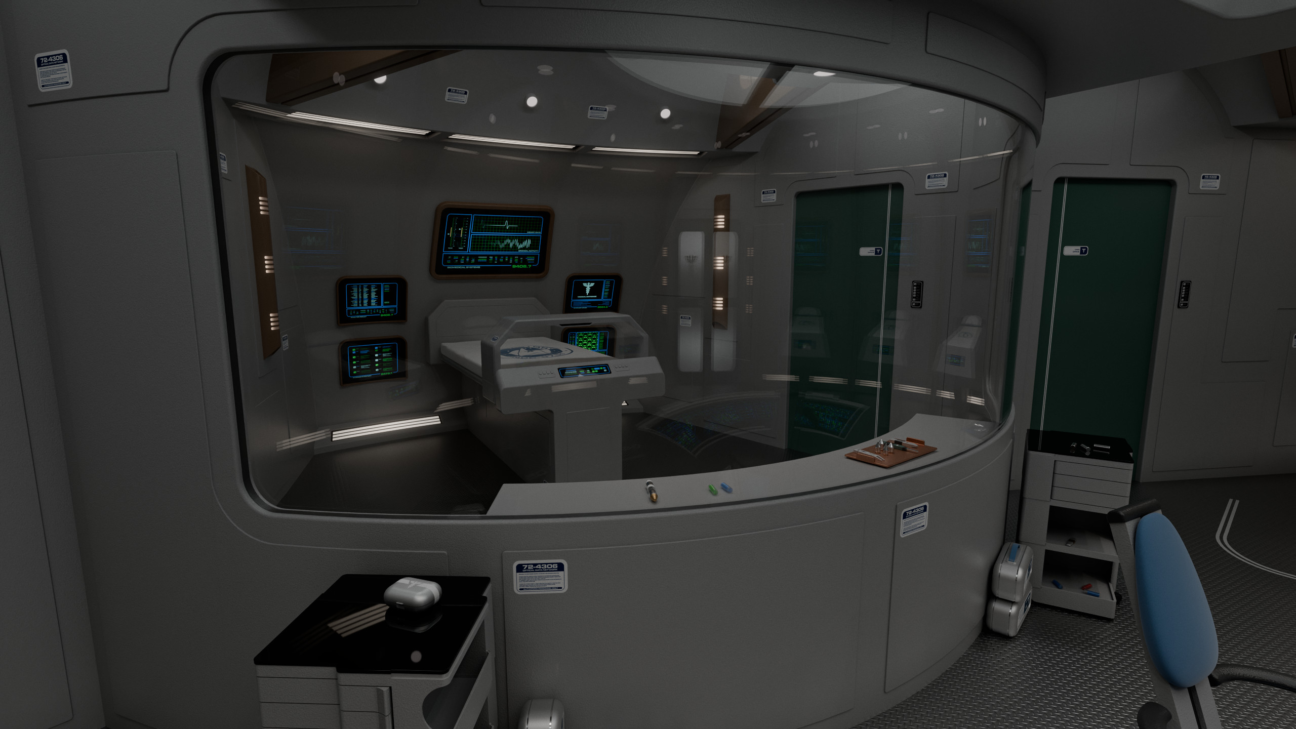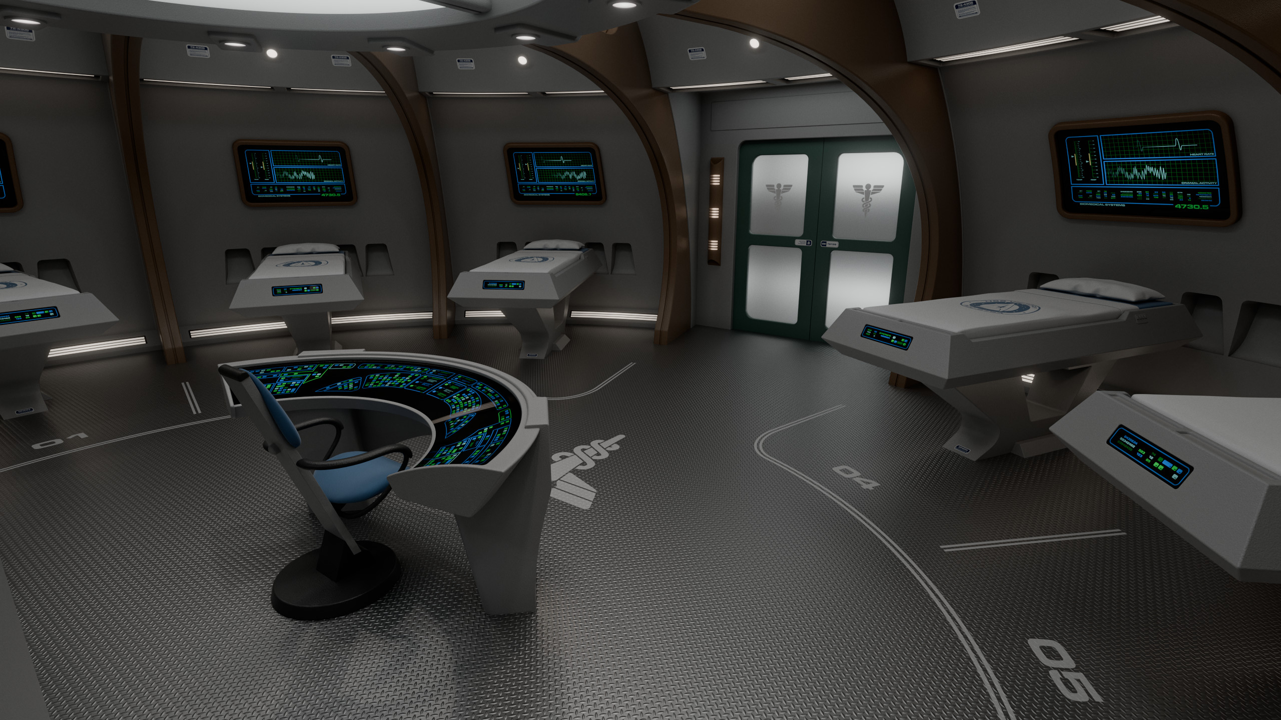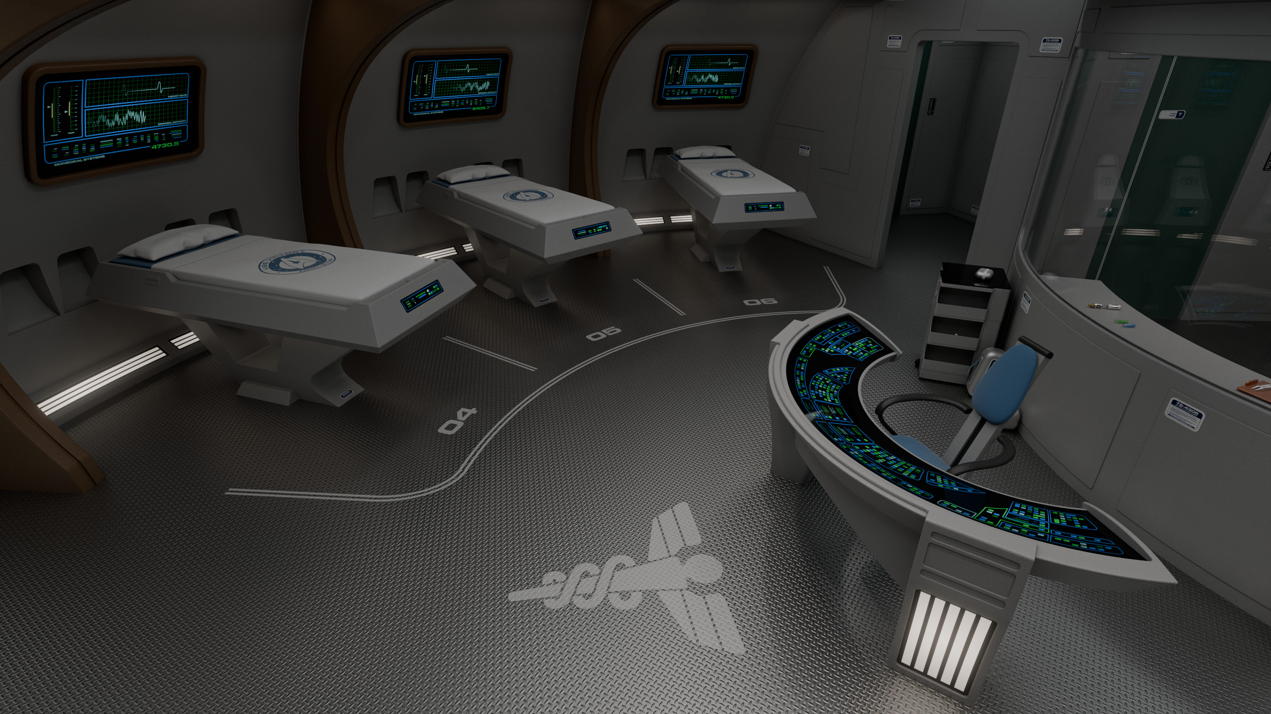 The main ward had 6 numbered biobeds and a central console operated by a nurse, behind which was a glass panel overlooking the examination room. This soundproof glass division allowed observers to check on medical procedures without interfering, though it could be made opaque from the inside of the room if necessary.