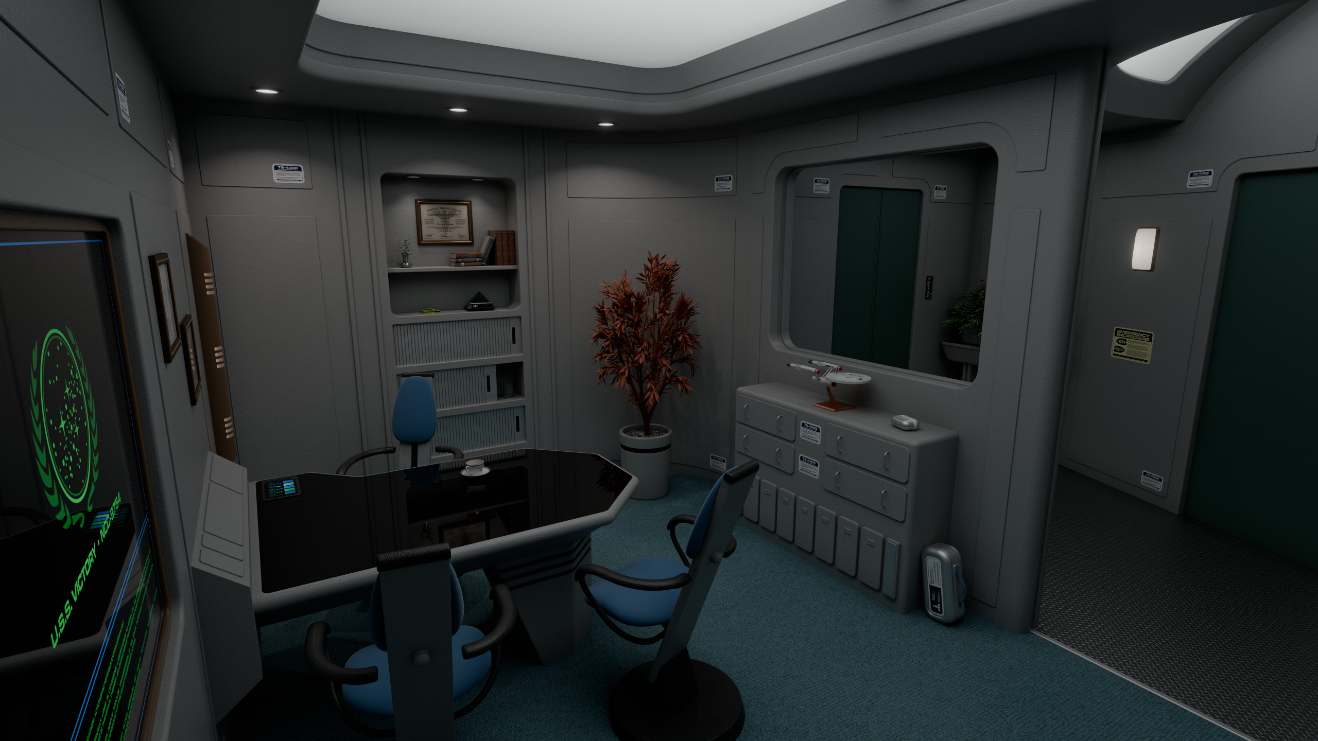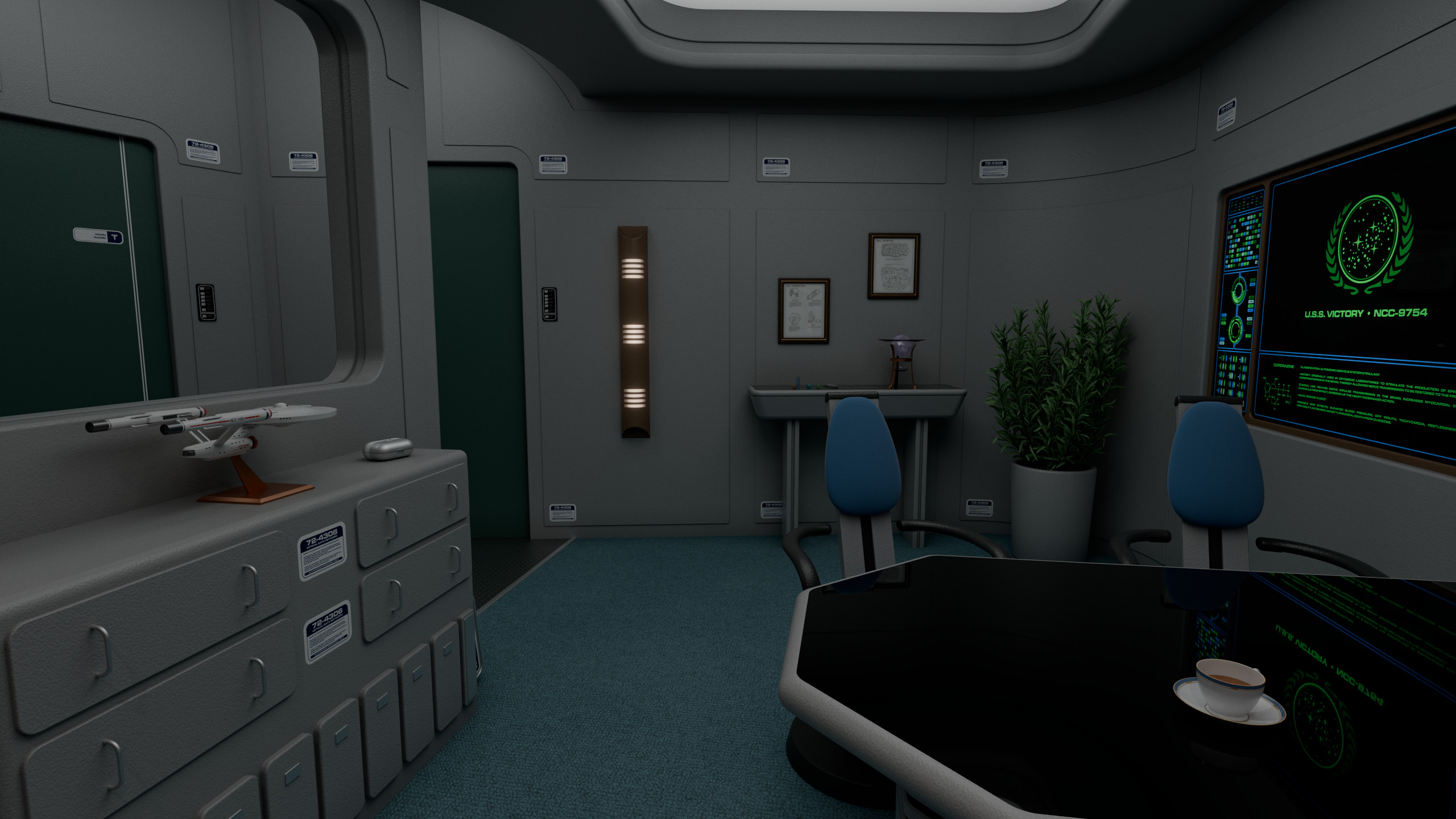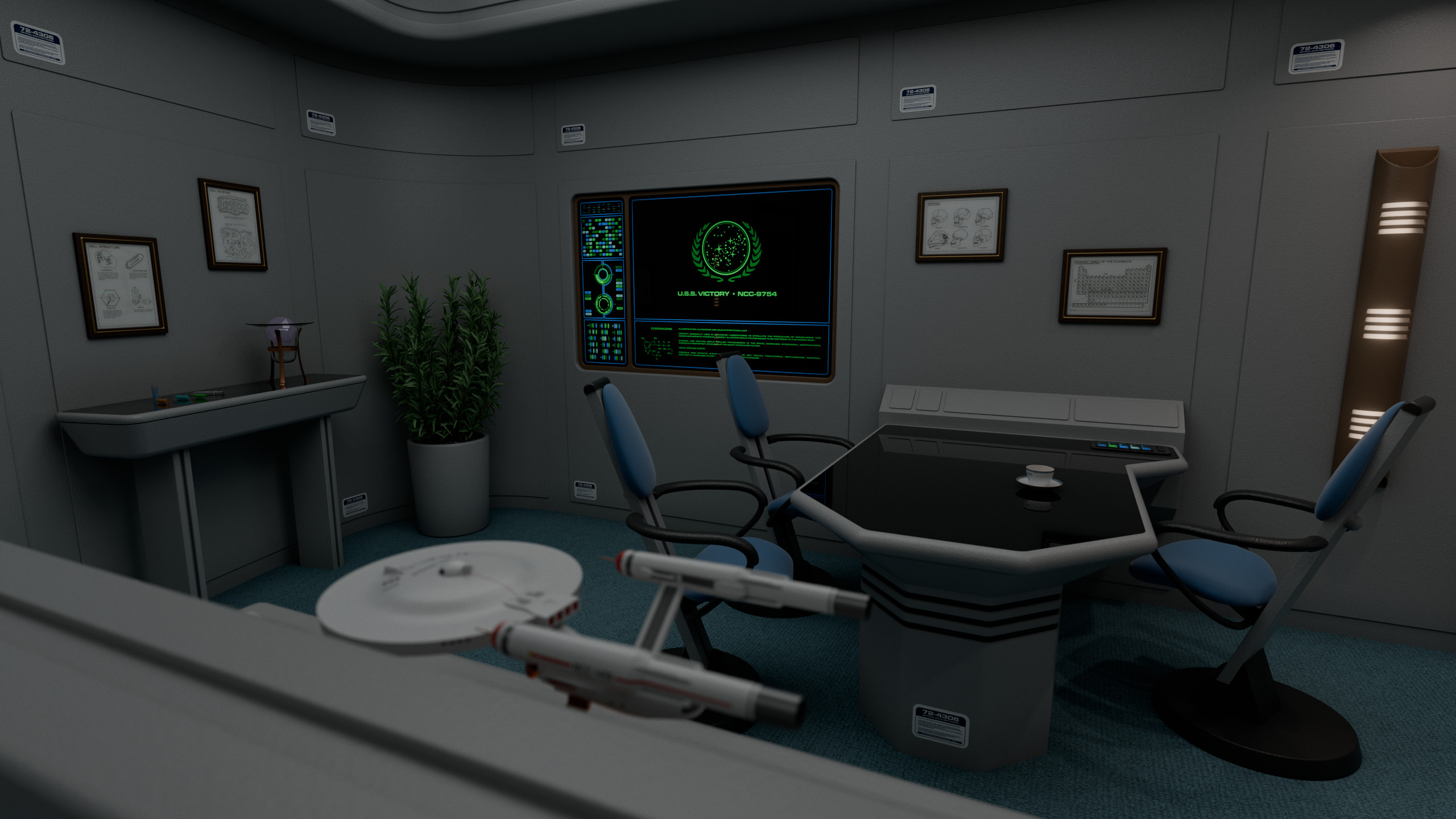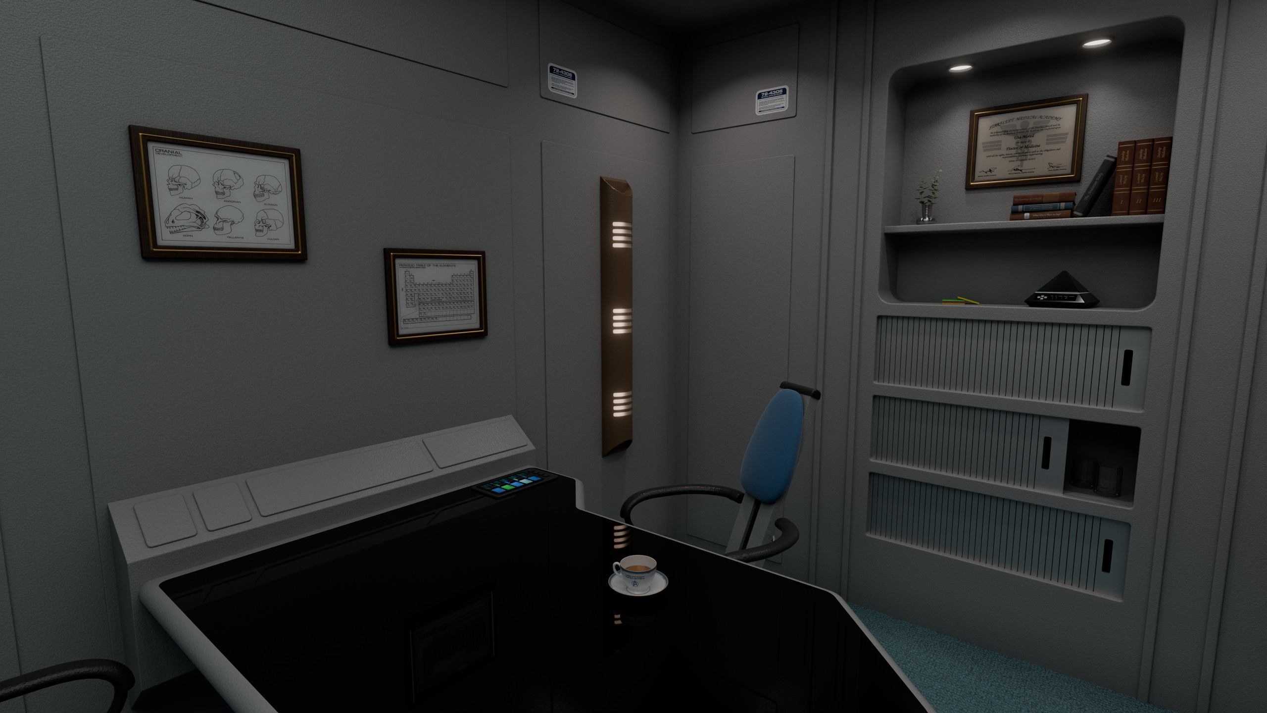 (The office contains artwork from the fan-made "Star Fleet Medical Reference Manual", originally released in 1977 and created by Eileen Palestine, Geoffrey Mandel, Doug Drexler and Anthony Fredrickson.)