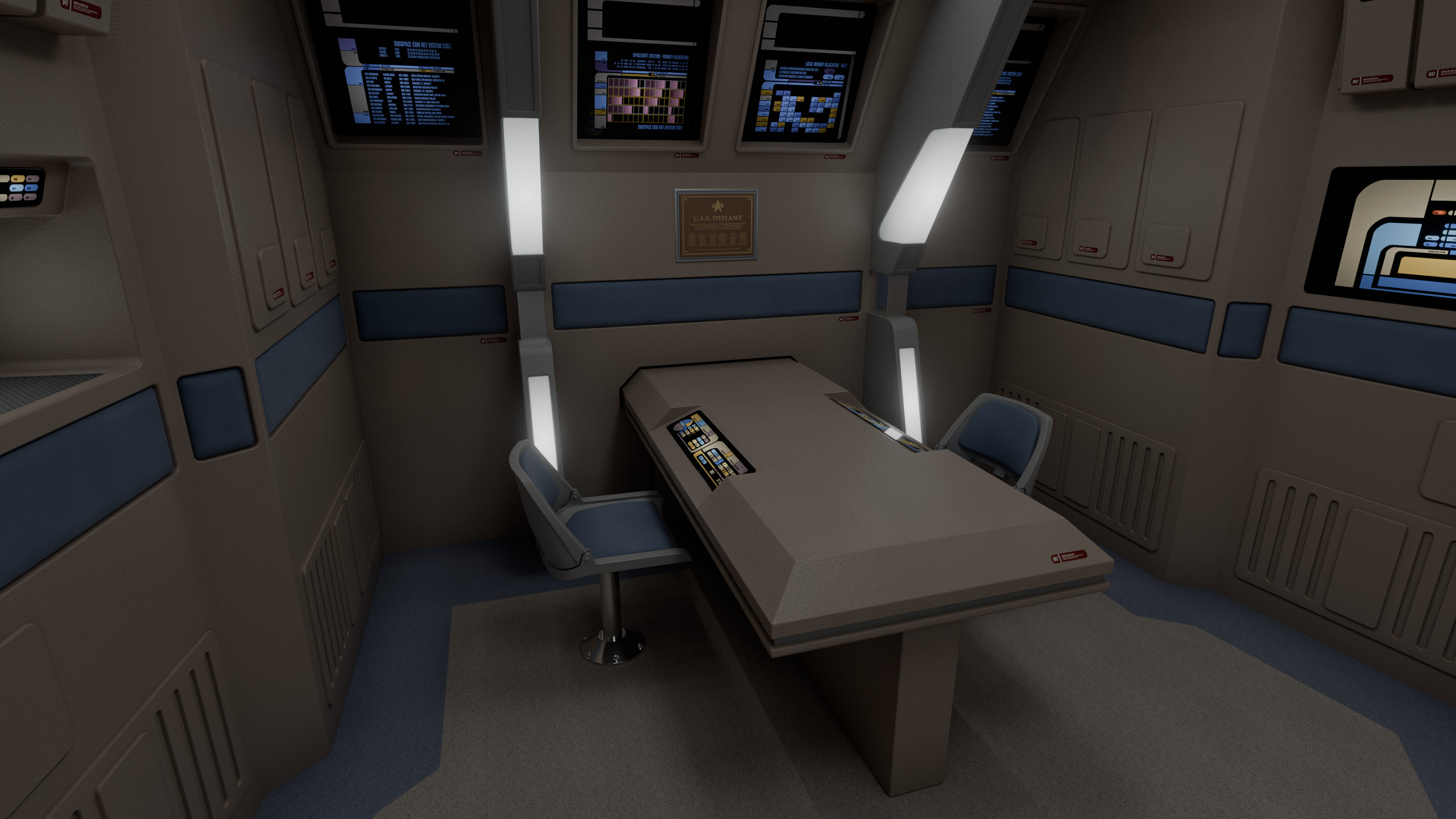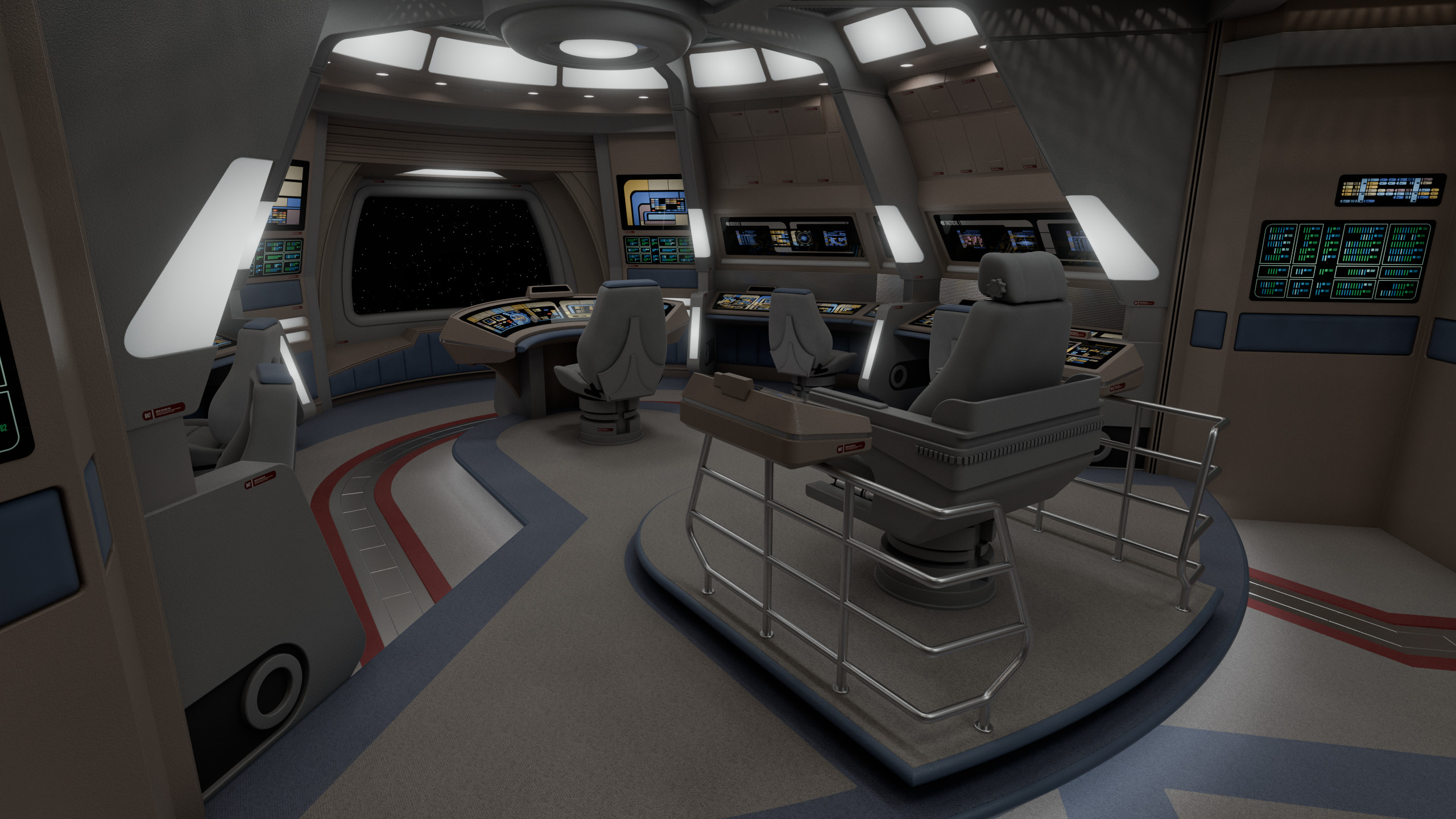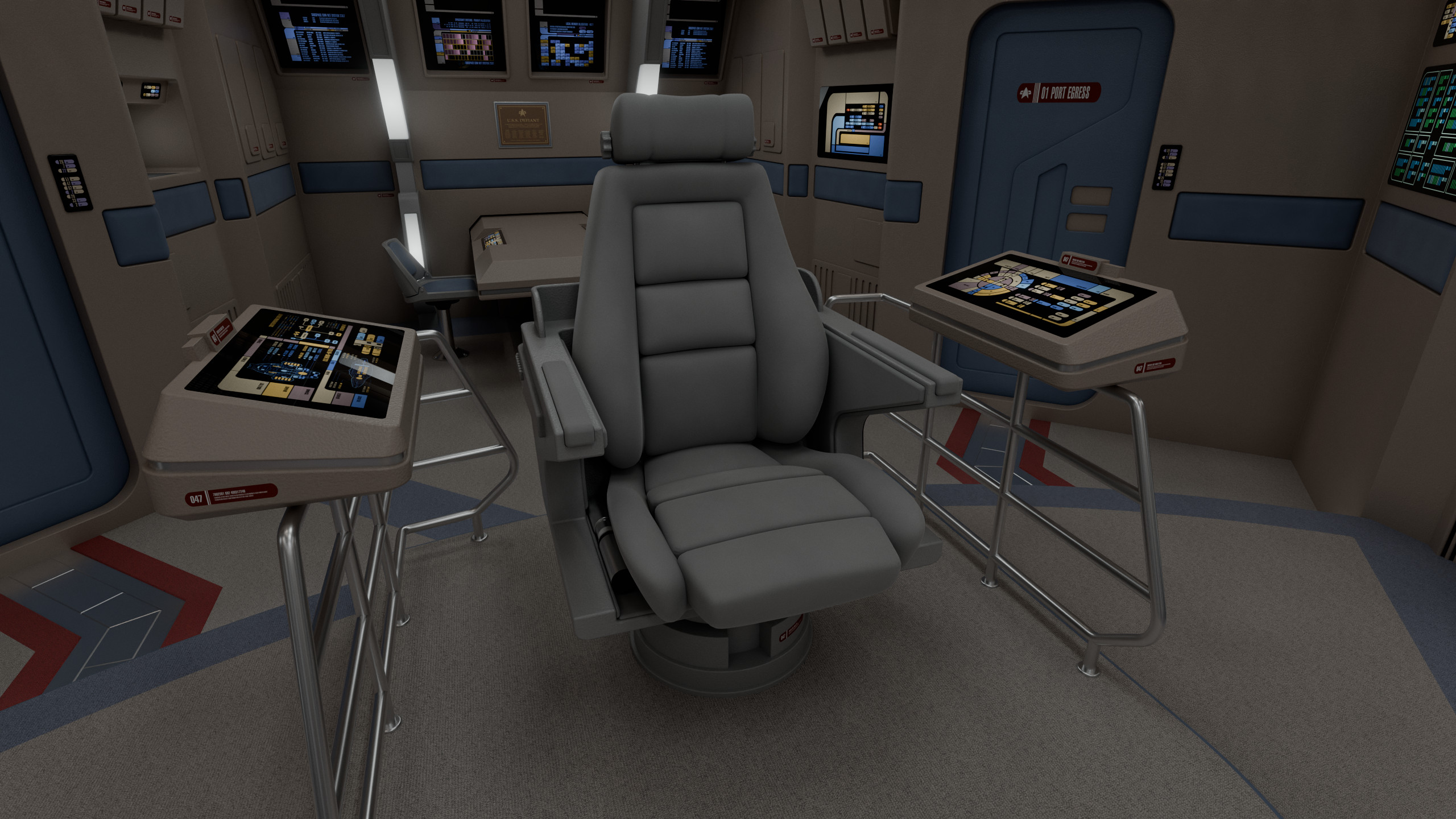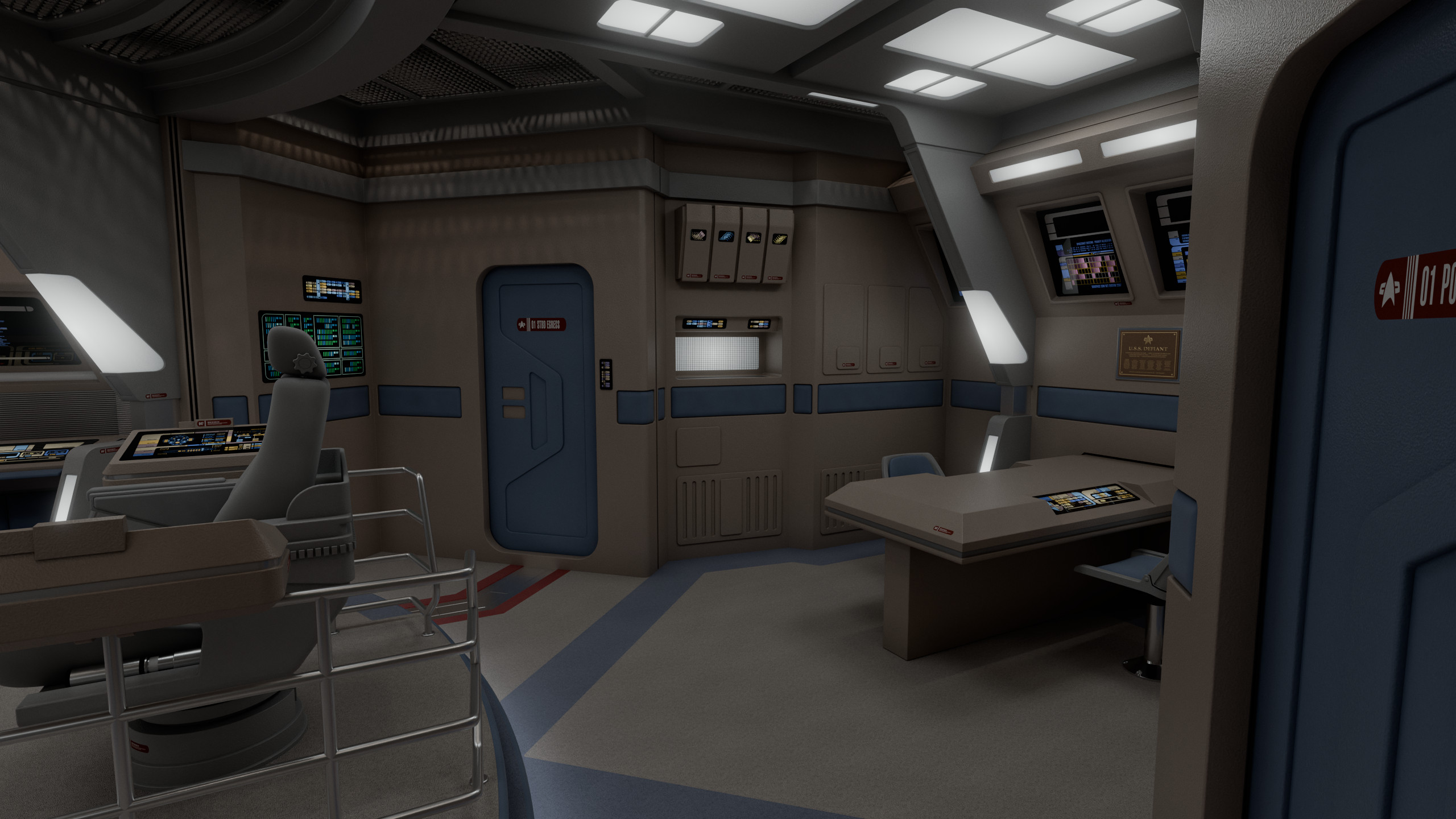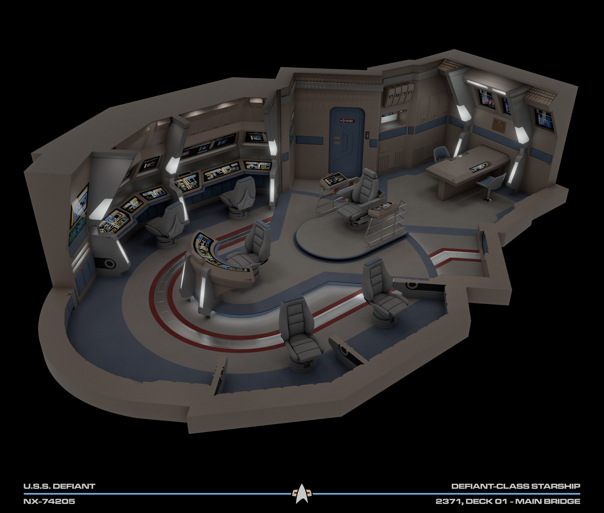 This model was originally created for OTOY and The Roddenberry Archive, you can fully explore this room at https://roddenberry.x.io/2371-uss-defiant-nx-74205/?view=Bridge.