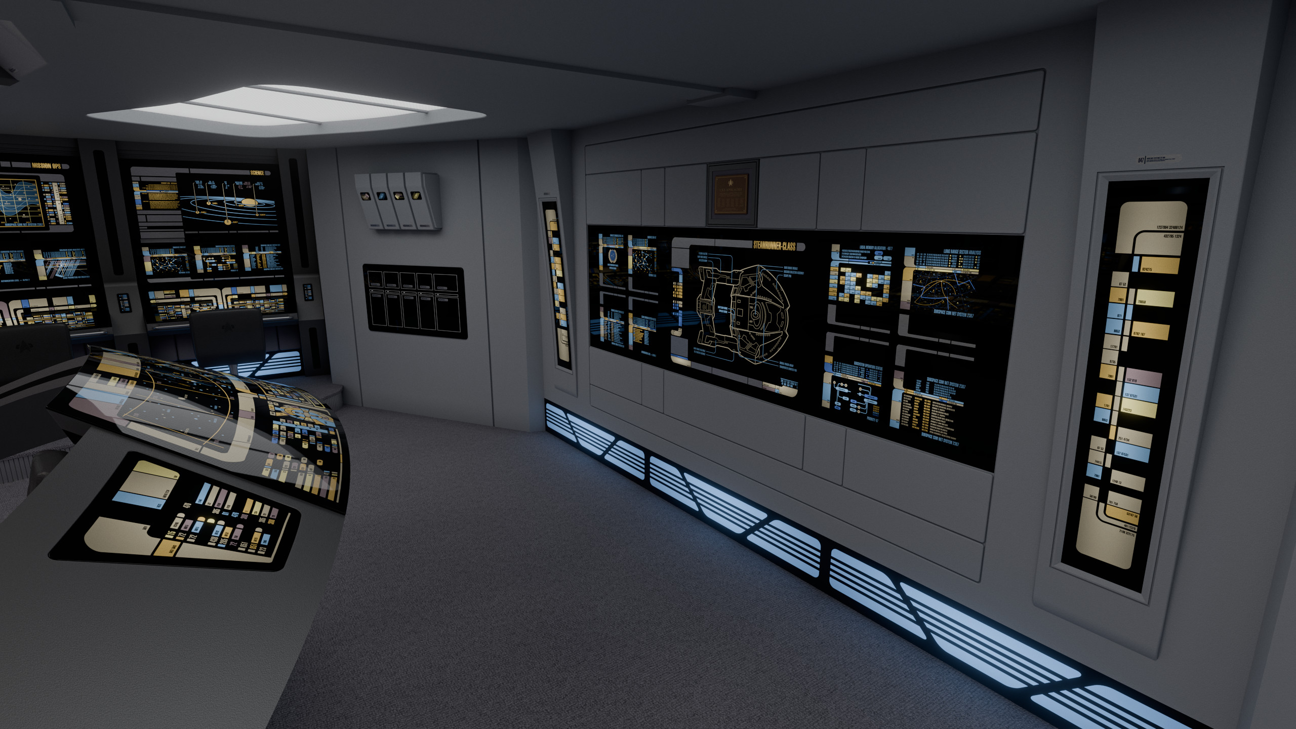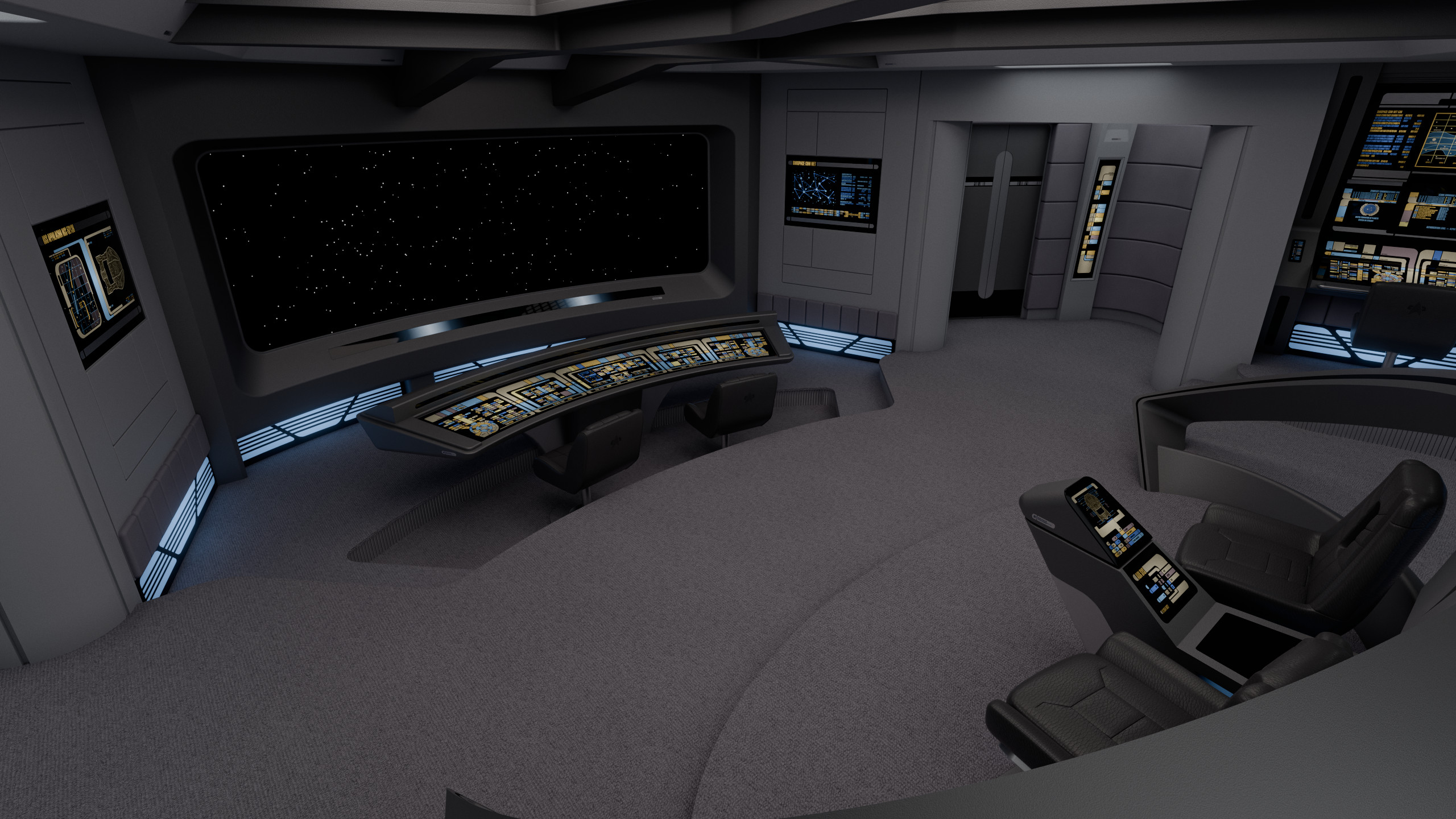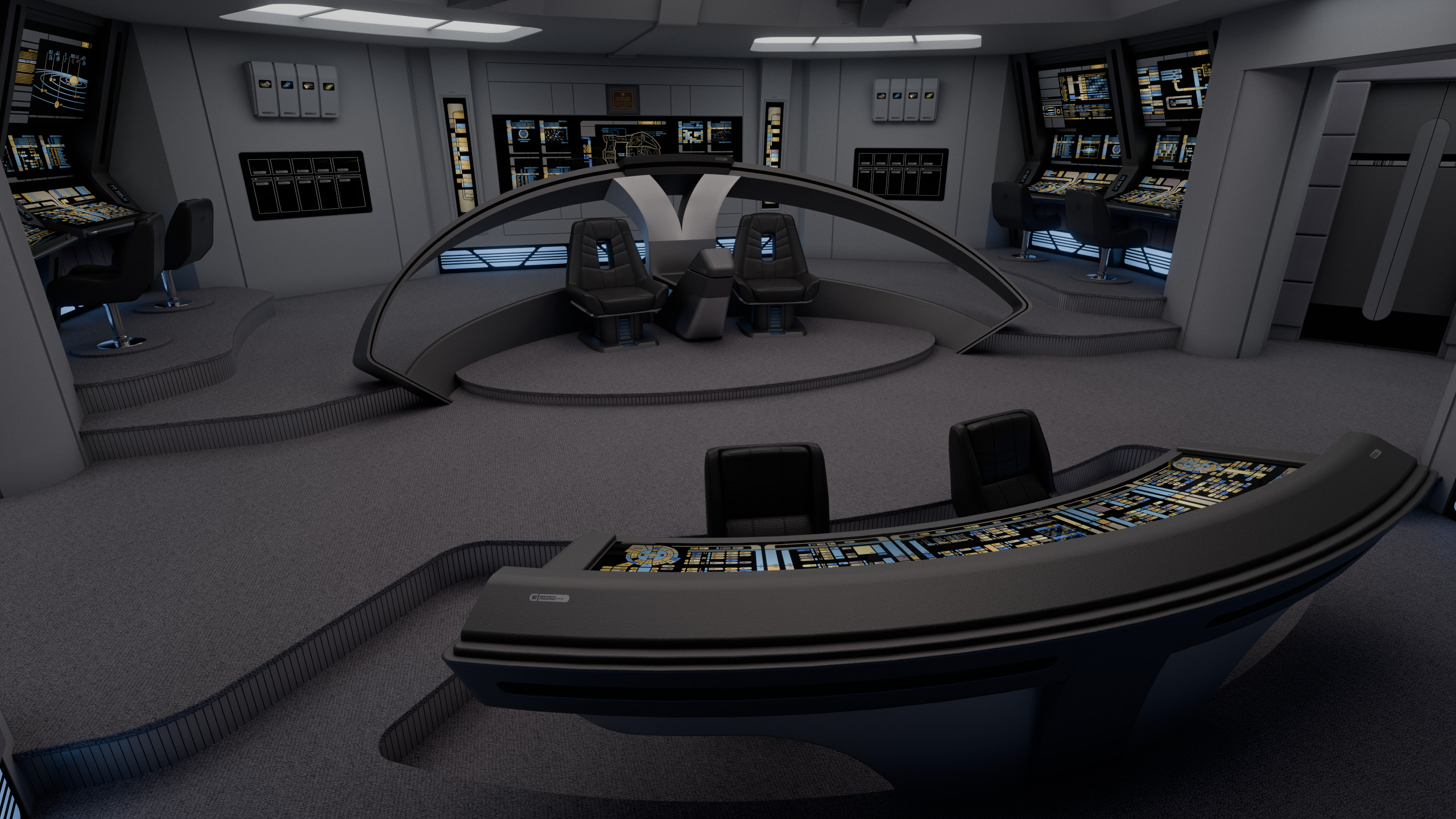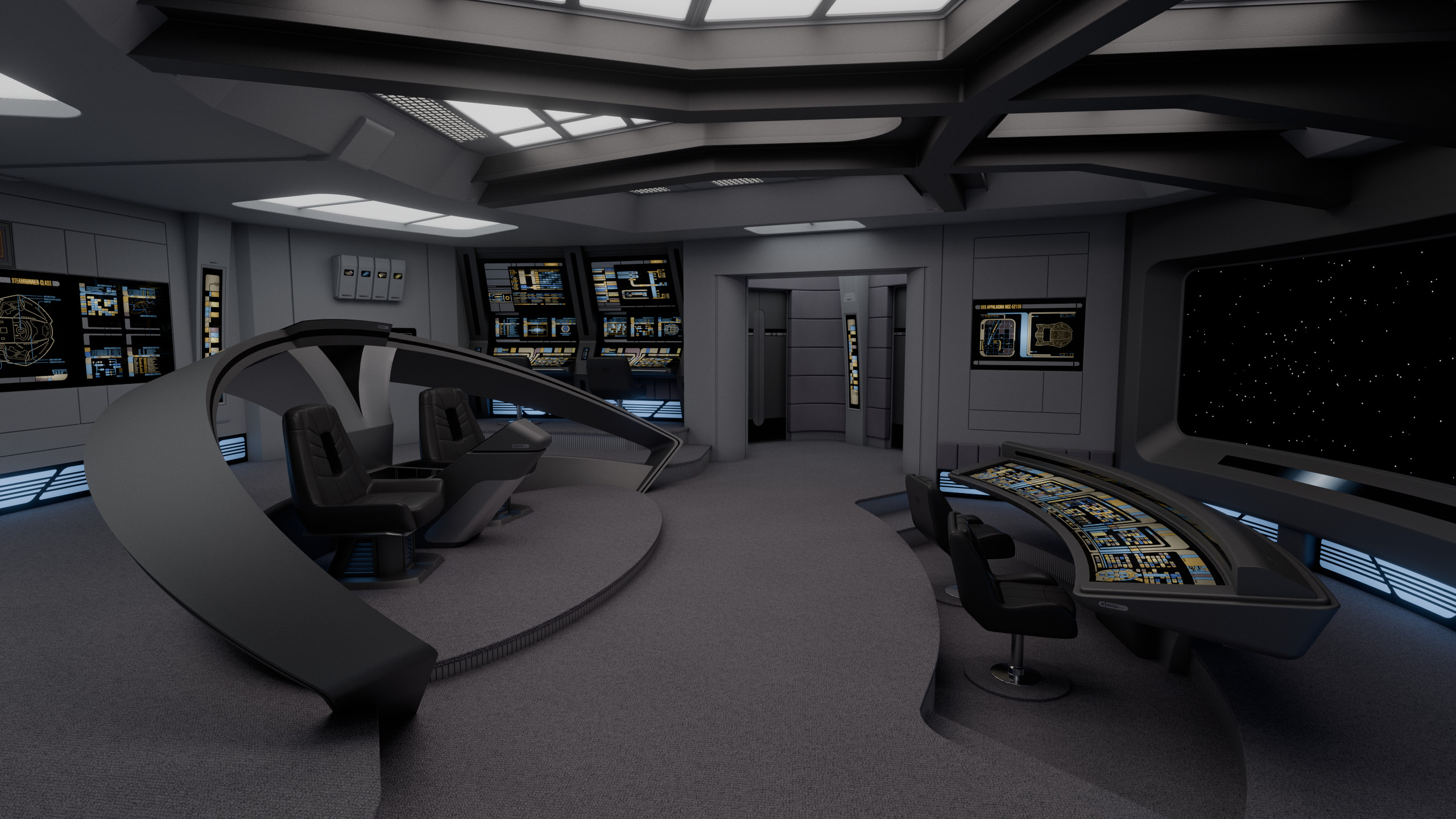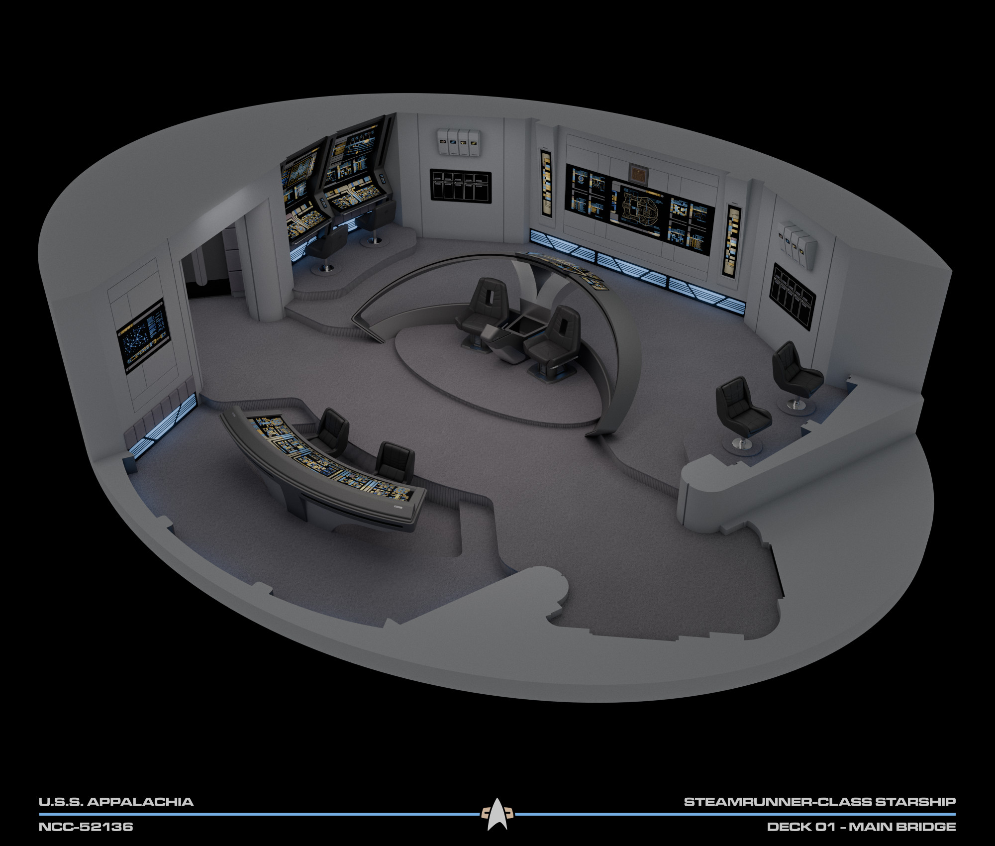 Appalachia's bridge featured elements common of the era; such as a combined flight control and operations console sunken in front of the viewscreen; the captain and XO chairs positioned off-center (starboard and port respectively), with a command console between them; and a tactical arch behind the said command area. The remaining consoles at the sides were, working clockwise from the viewscreen: mission ops, science, environment, and engineering.