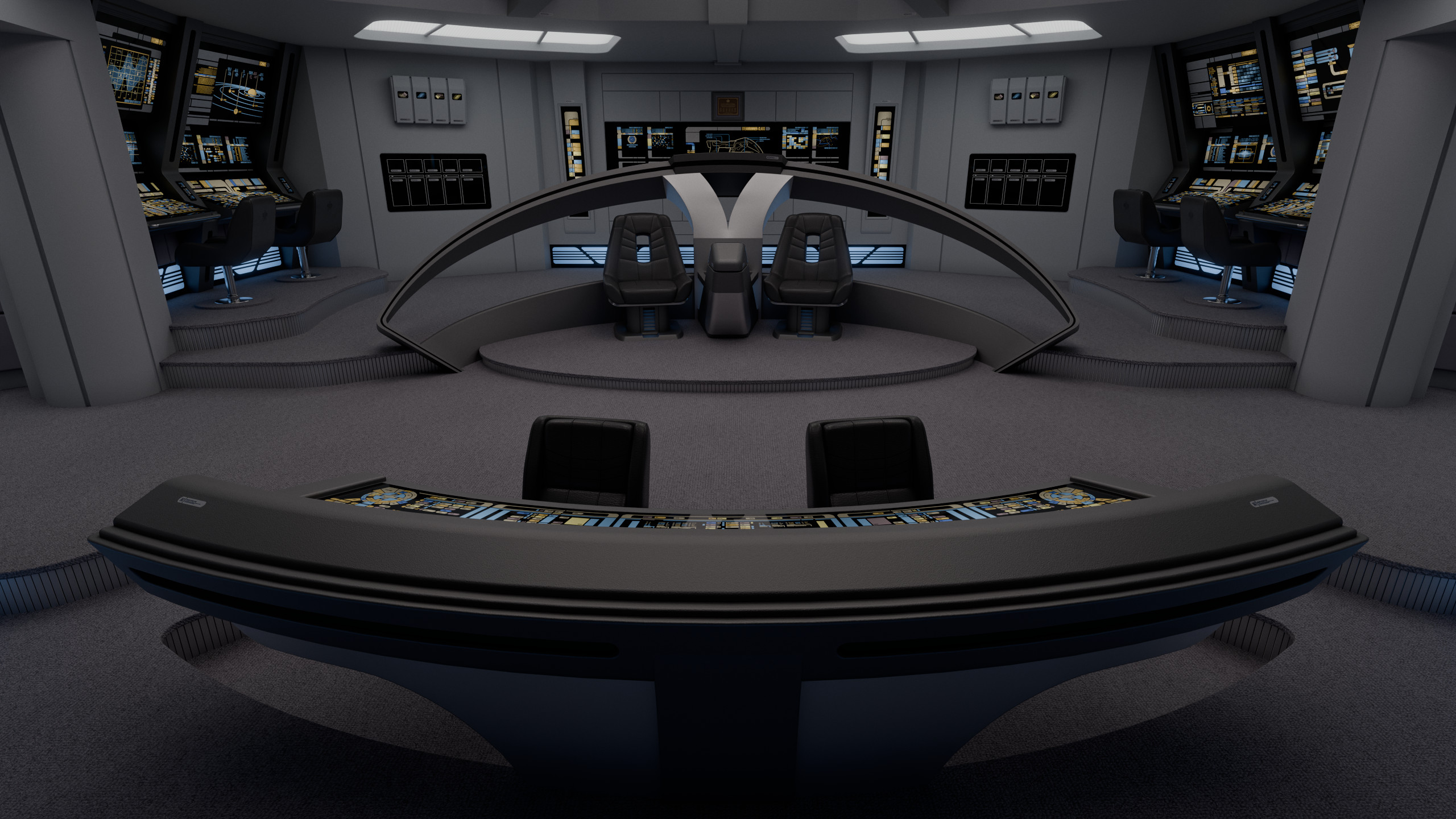 Appalachia's bridge featured elements common of the era; such as a combined flight control and operations console sunken in front of the viewscreen; the captain and XO chairs positioned off-center (starboard and port respectively), with a command console between them; and a tactical arch behind the said command area. The remaining consoles at the sides were, working clockwise from the viewscreen: mission ops, science, environment, and engineering.