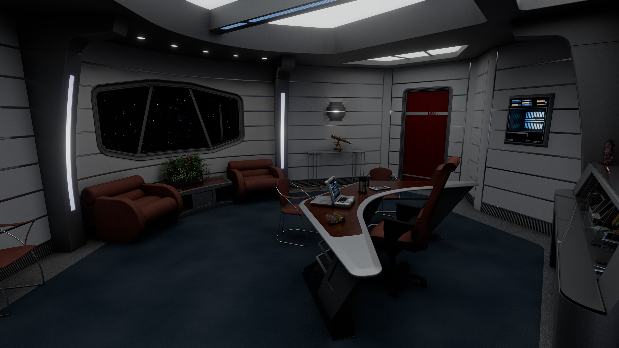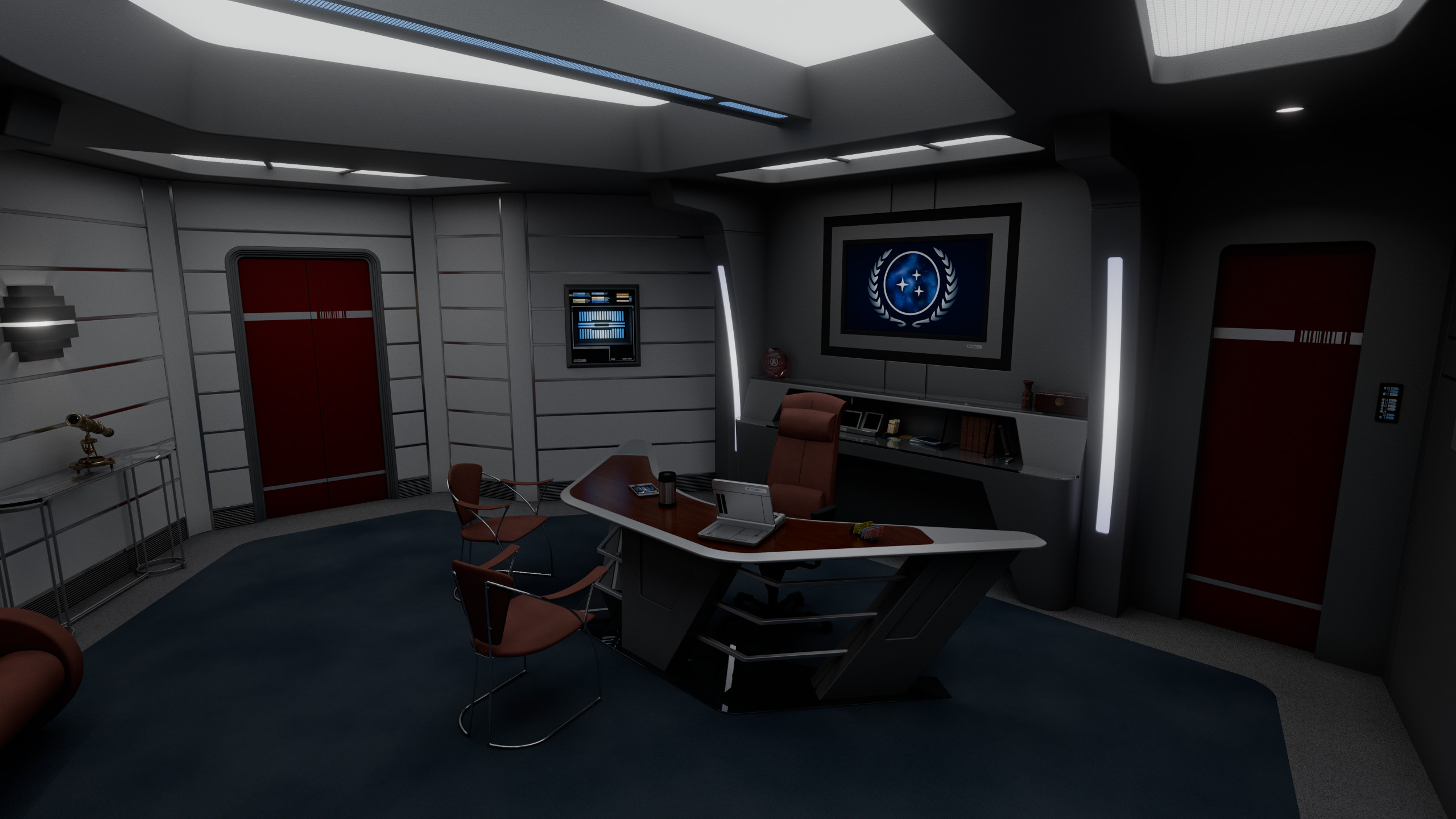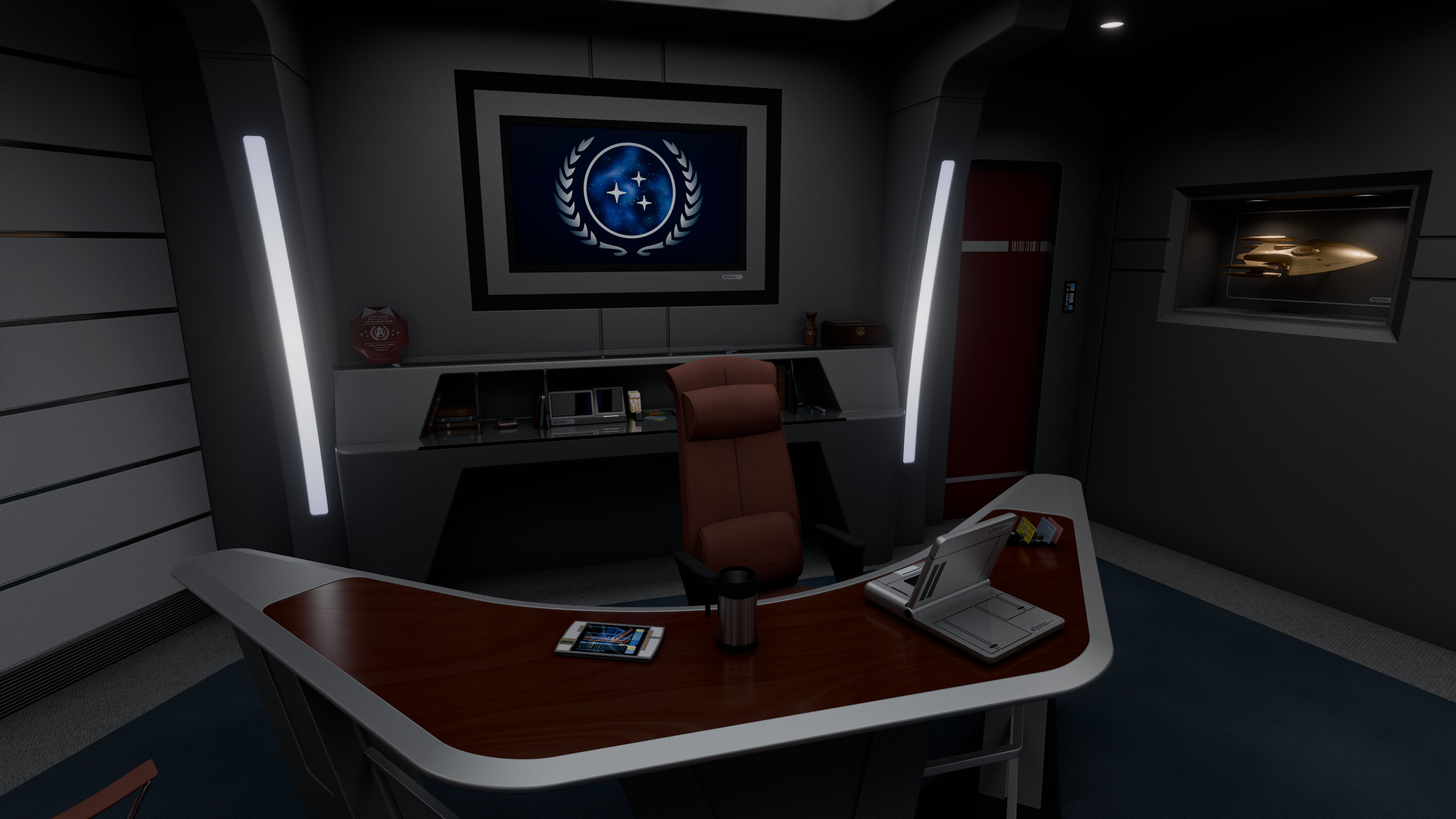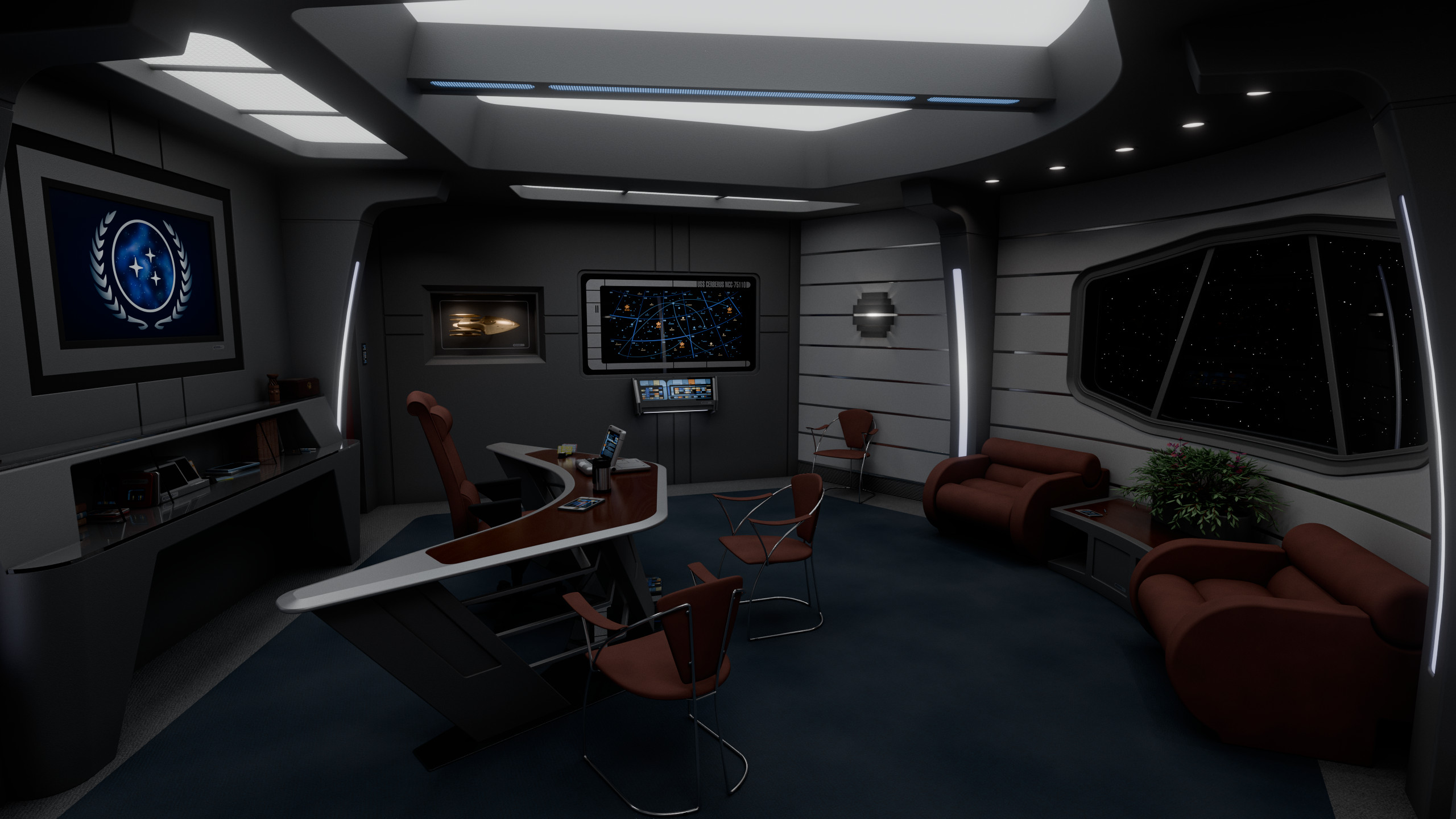 The admiral’s desk occupied the center of the room, behind it was a large illuminated logo of the United Federation of Planets, visible on any communication the admiral would engage on from the room. The wall to the left of the desk featured a large LCARS display with a direct uplink to Starfleet Command, as well as a model of Cerberus. Between this wall and the desk was a door leading to a small lavatory.
